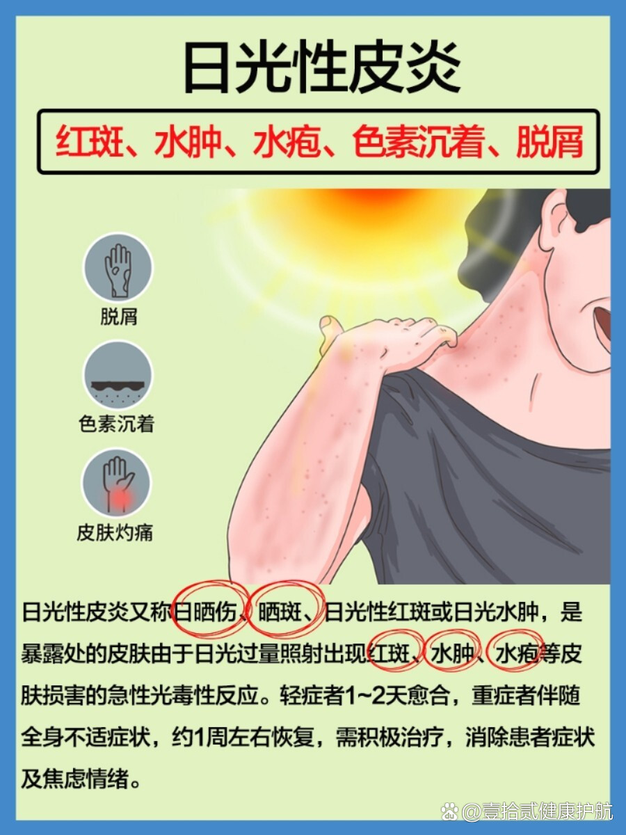 日光性皮炎目前无法根治,但可通过科学预防和规范治疗有效控制症状一预防措施 1 规避强光暴露上午10点至下午2点紫外线最强,应避免在此时间段进行户外活动若需外出,需提前2030分钟涂抹SPF50+PA+++及以上的防晒霜,并每23小时补涂一次2 物理防护穿戴长袖衣物宽边遮阳帽太阳镜,使用遮阳伞或防晒衣,减少;日光性皮炎的治疗需结合一般治疗药物治疗光疗及预防措施,具体方法如下一一般治疗立即脱离日晒环境,避免紫外线进一步刺激皮肤用冷水或冰水冷敷患处1520分钟,可缓解红肿和疼痛清洗皮肤时选择温和的清洁剂,避免使用含酒精或香料的护肤品穿着宽松透气的棉质衣物,减少摩擦每日使用无刺激的。