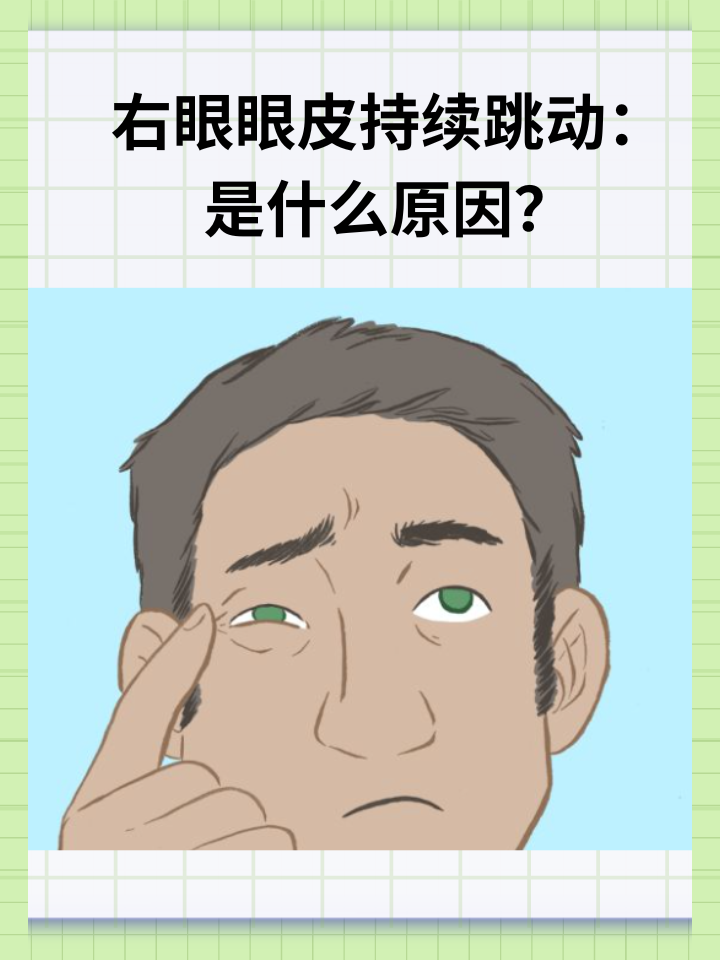 4、右眼跳通常是由眼部肌肉不自主抽搐引起的,常见原因及缓解方法如下常见原因1疲劳或压力长时间用眼如盯着电脑手机屏幕睡眠不足或精神压力过大,会导致眼部肌肉疲劳和紧张,引发眼皮跳动2缺乏维生素或矿物质维生素B12钙镁等营养素的缺乏,可能影响神经肌肉功能,导致眼部肌肉抽搐3;2病理眼跳病理性眼跳多半是肌肉痉挛所致,有时眼睛跳动会伴随眼部嘴角脸部肌肉的抽动,并且可能会出现头晕不适肌肉酸痛等症状,这种情况下,最好找到病因并消除,才能解决问题,如果眼皮总是跳动不止,需要得到足够的重视,因为这种病理性的眼皮跳动有时预示着颅内疾病,支配眼皮肌肉运动的面部神经。