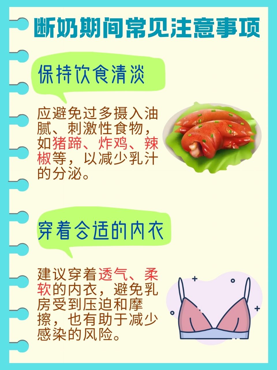 春季断奶有以下注意事项逐渐减少喂奶次数为了给宝宝断奶,家长需要逐渐减少喂奶的次数这是一个宝宝必须经历的过程,即使宝宝可能会感到不适应如果宝宝在断奶过程中总是哭闹,想要吃奶,宝妈需要控制自己的情绪,不要心软,这是为了宝宝的健康成长着想注意乳房卫生在断奶过程中,由于喂奶次数减少;断奶妈妈饮食注意事项主要包括以下几点避免营养丰富的汤水断奶期间,妈妈应尽量避免摄入营养丰富的汤水,如鸡汤鱼汤等,因为这些食物可能会促进乳汁分泌,导致乳房肿胀加剧减少辛辣刺激食物辛辣刺激的食物可能会引发炎症或加重身体不适,因此断奶期间应尽量减少这类食物的摄入多吃回奶食物为了减轻;宝宝的断奶食物不要放过多的调味料,避免加重宝宝的肠胃负担#xF372蒸的方法保证营养不流失宝宝的食物最好用蒸的方法来保证营养不流失,同时注意宝宝的辅食一定要尽快喂给宝宝吃#xF35A用可爱的小碗盛放食物盛放宝宝食物的器皿可以挑选图案可爱的颜色丰富的小碗,促进宝宝的食欲,能够帮助宝宝对食物的兴趣,尽快让宝宝实现完全;娃娃断奶注意事项主要包括以下几点选择合适的断奶时间避免在夏天断奶因为夏天天气炎热,胃肠道消化功能减弱,容易引起消化不良等胃肠道疾病最好在春秋两季断奶气候宜人,宝宝较容易适应注意宝宝健康状况不要在宝宝患病期间断奶患病期间宝宝抵抗力差,消化功能不好,断奶可能影响身体康复,甚至。