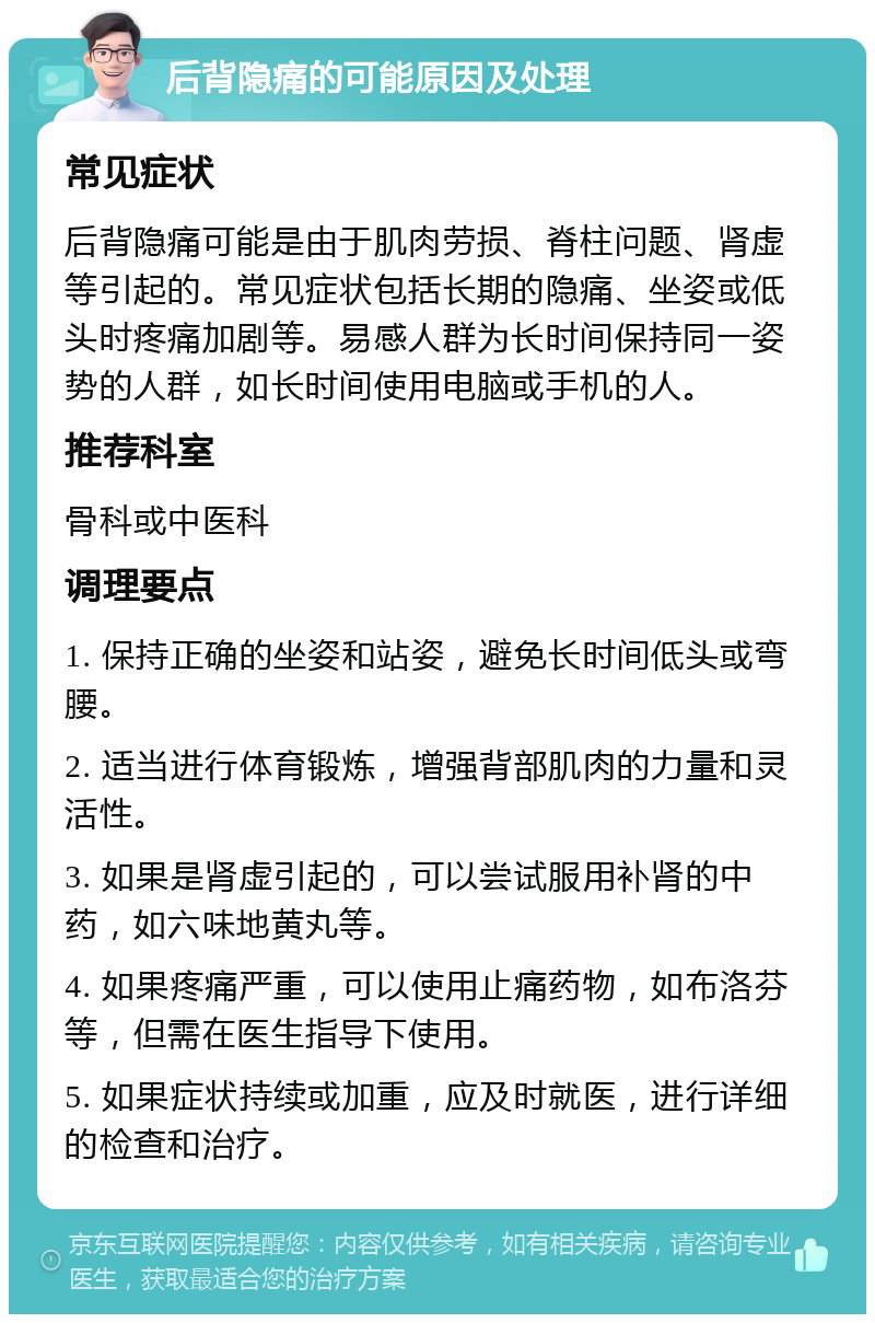 4、左边后背痛可能由多种原因引起,需根据具体症状判断并采取相应措施常见原因及处理建议肌肉劳损或拉伤过度使用背部肌肉姿势不当或剧烈运动可能导致建议休息,避免过度劳累,热敷疼痛部位促进血液循环,或冷敷减轻炎症可短期使用非处方止痛药如对乙酰氨基酚,但需遵医嘱脊柱问题脊柱关节炎。