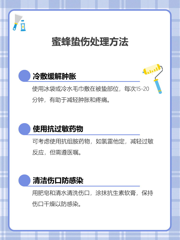 4、被蜜蜂蛰后几天仍肿痒的处理与注意事项 被蜜蜂蛰后,肿痒症状通常在1至3天内自行消退,但具体持续时间受个体差异毒液量及过敏反应程度影响若症状持续超过3天或加重如肿胀扩散疼痛剧烈皮肤发热等,需及时就医原因与机制蜜蜂蛰刺会释放酸性毒液,引发局部炎症和过敏反应,导致肿痒疼痛毒液量多或个体过敏时,症状可能更严重且;被野生蜜蜂蛰后通常需要13天消肿,具体时间受蛰伤严重程度和个体差异影响蛰伤后的局部反应野生蜜蜂蛰伤后,毒液中的蛋白质会引发局部炎症反应,导致蛰伤部位出现红肿疼痛灼热感,严重时可能伴随水疱或皮肤坏死这些症状是免疫系统对蜂毒的正常反应,但严重程度因人而异消肿时间的影响因素症状。