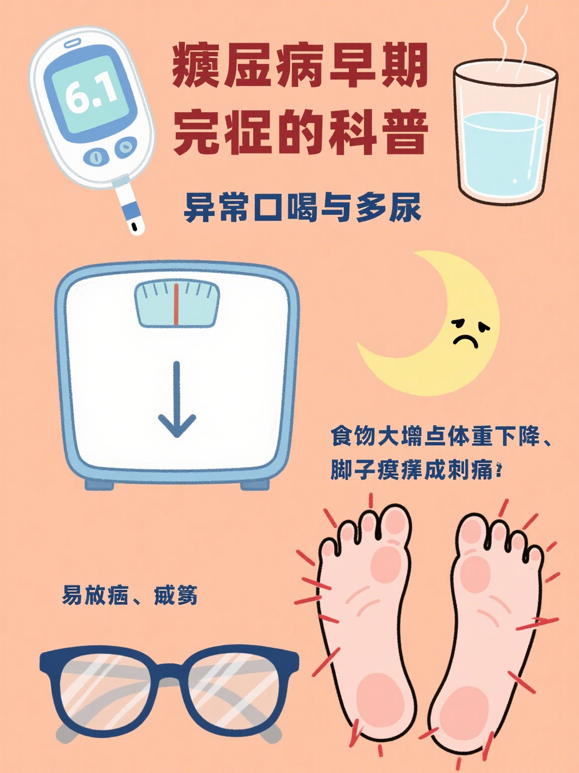 我了解到糖尿病的早期症状包括频繁口渴多尿疲劳体重下降持续饥饿感伤口不易愈合视力模糊手脚麻木或刺痛感应及时检查血糖水平早期发现和治疗糖尿病避免并发症在糖尿病的早期阶段,因为葡萄糖在眼睛积聚,暂时改变其形状,导致眼睛不能聚焦在血糖稳定下来后约六至八周,视物模糊症状就会消失,眼睛也会自动调整需要注意的是。
