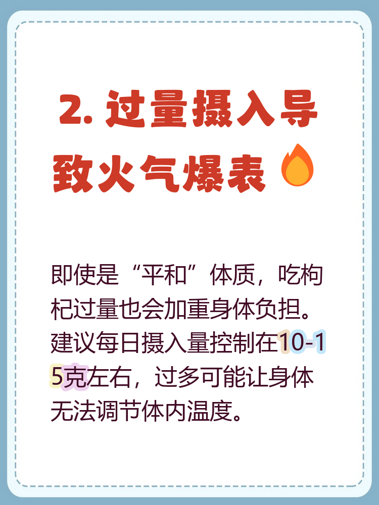 如果服用量过大,或者是本身是阳热体质或者阴虚体质的情况,就有可能会出现上火的情况2此外,如果是春天或者是秋天,口服枸杞子也容易出现上火的情况,主要是由于这两个季节气候比较干燥所以一旦出现上火的情况,要暂时停止服药,适当的多喝水,多吃一些蔬菜水果,能够很快的调整过来;吃枸杞子的禁忌主要包括以下几点阴虚体质者易上火阴虚体质的人食用枸杞子时应注意控制用量,因为枸杞子性甘温和,过量食用可能导致上火,尤其是生吃时更应减少用量过量食用有害虽然枸杞子含有甜菜碱氨基酸胡萝卜素等多种对人体有益的成分,但过量食用会导致上火流鼻血眼睛红胀等不适症状。