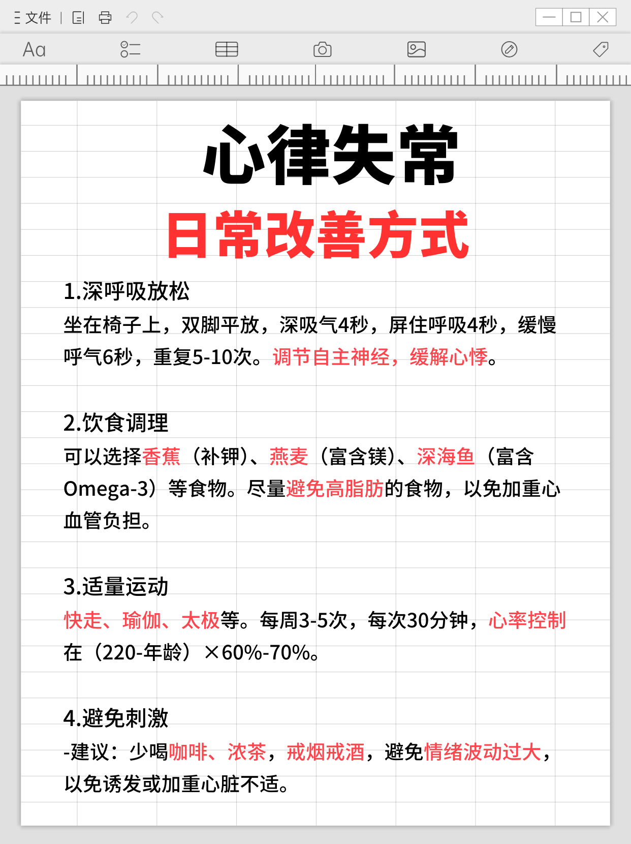 窦性心律过快的调理方法主要取决于其病因以下是具体的调理建议生理性因素导致观察与休息通常不需要特别处理,以观察病情和充分休息为主避免过度劳累情绪激动等可能诱发窦性心动过速的因素失血引起纠正失血及时补充血容量,通过输血或输液等方式恢复血液循环的稳定,从而缓解窦性心动过速贫血引起纠正贫血;窦性心律过快的调理需从生活方式饮食情绪管理三方面入手,必要时需明确病因并治疗原发病一生活方式调整适度有氧运动可增强心肺功能,改善心脏节律调节建议每周进行至少150分钟中等强度运动,如快走每分钟60100米,但需循序渐进,避免剧烈运动导致心率进一步加快有基础疾病者如冠心病需。