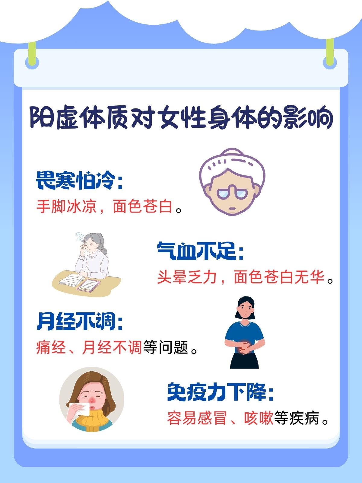 3、女性阳虚体质的表现及调养方法 阳虚体质的主要表现 畏寒肢冷四肢及手足常感冰冷,严重时肘膝关节出现冷痛感即使处于温暖环境,寒冷感也难以缓解,这是阳气不足导致温煦功能减弱的表现白带清稀白带量多且质地稀薄,类似清鼻涕,可能伴有异味或下腹坠胀感此症状与肾阳不足脾失运化相关,导致。