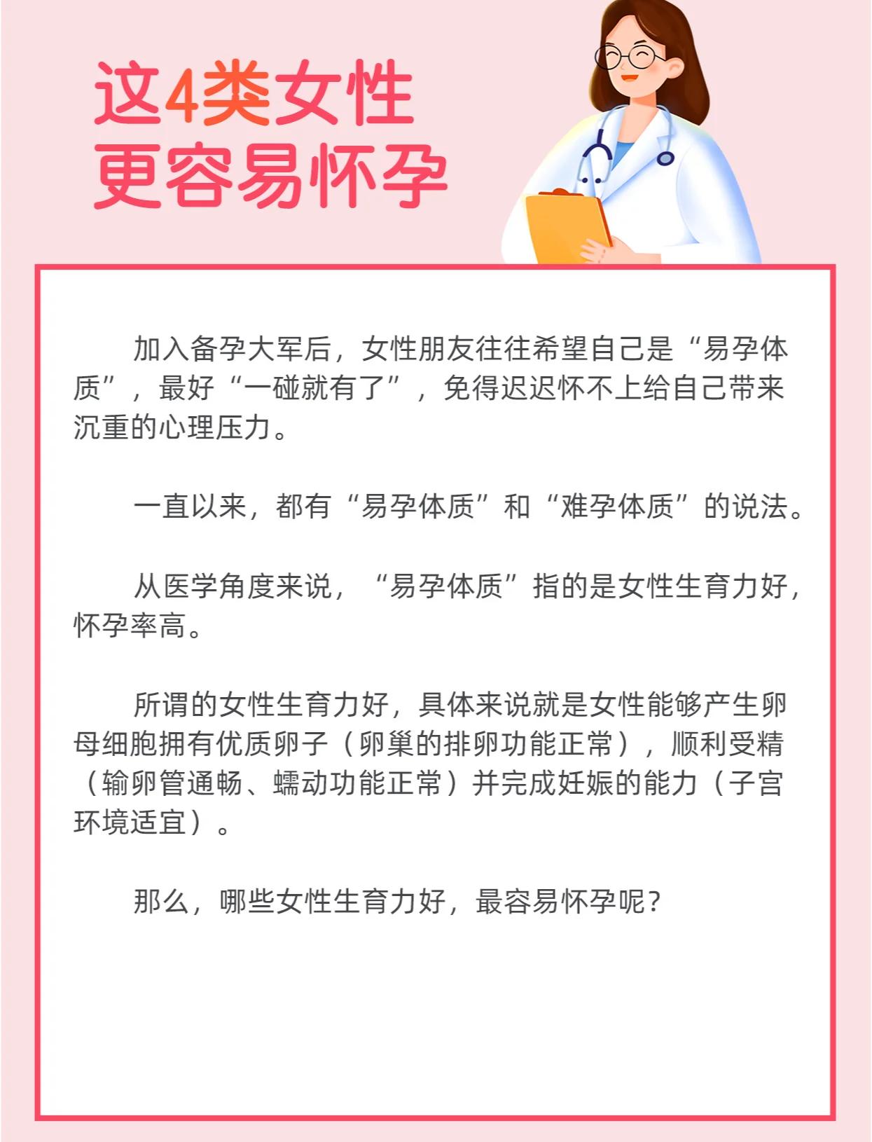 1月经规律 月经是否规律是判断女性容不容易受孕的重要依据月经正常的女生一般排卵都会正常,身体机能也不会有问题加上能够定位排卵期,那么怀孕就是一件顺利成章的事情啦 2子宫前位 子宫是孕育宝宝的地方,子宫的位置越靠前,就越容易着床受孕但大部分的女性都是子宫中位 子宫的环境也会直接影响女性怀孕。
