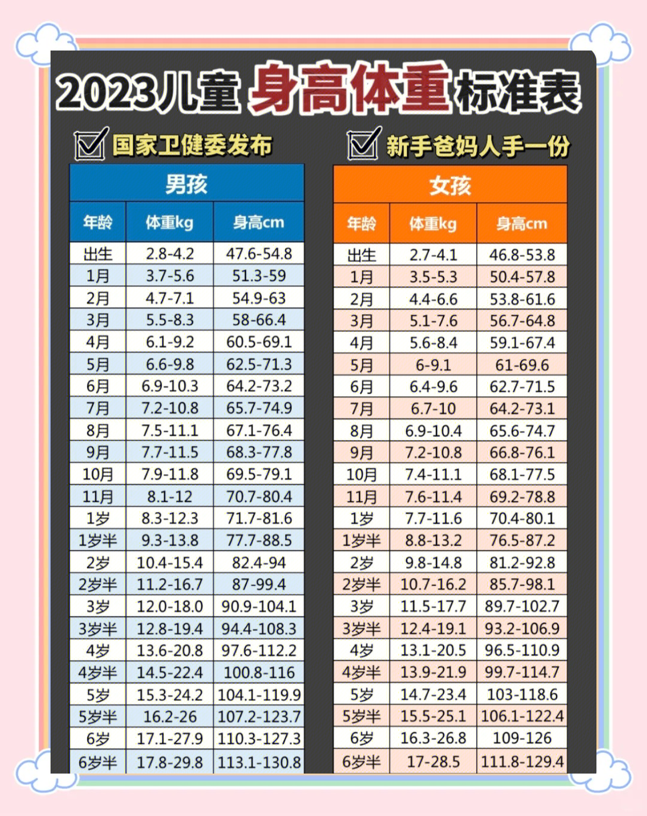 婴儿身高体重标准参考1个月男身高482528cm,体重3650kg女身高477520cm,体重2736kg 2个月男身高521570cm,体重4360kg女身高512558cm,体重3445kg 3个月男身高555607cm,体重5069kg女身高544592cm。
