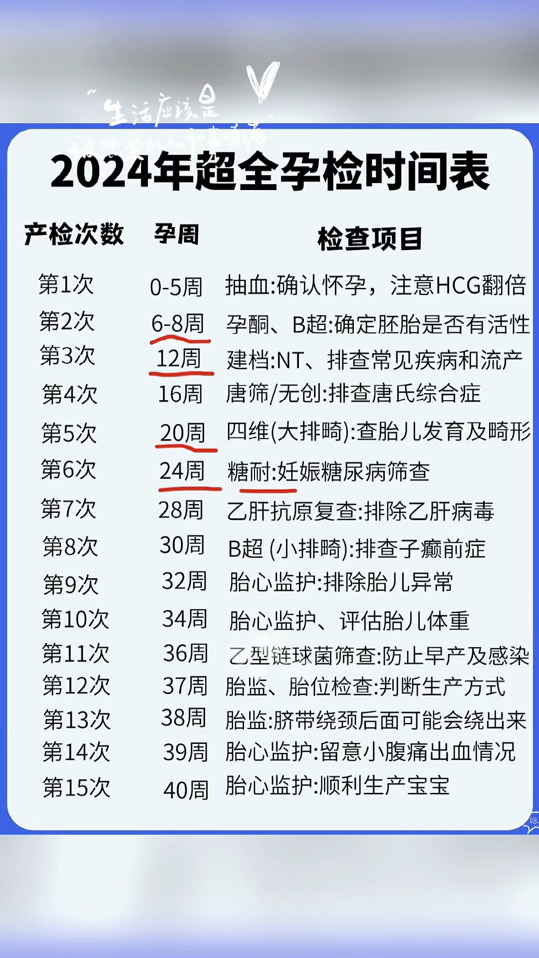 3、检查项目及时间表 1第六次产检怀孕30周 产检项目血压体重宫底高度腹围胎心率血常规尿常规 温馨提示这周的产检是进行常规的产检项目,准妈妈要注意每天都要自数胎动,发现异常就应该马上就医2第七次产检怀孕32周 产检项目血压体重宫底高度腹围胎心率;孕期不同阶段的检查项目有所不同,具体如下孕早期 全面身体检查确认怀孕后,孕妇需进行全面的身体检查,涵盖血常规尿常规血型肝肾功能等项目这些检查能够详细了解孕妇的基础健康状况,例如血常规可判断孕妇是否存在贫血等问题尿常规有助于发现泌尿系统感染等异常血型检查对于预防新生儿溶血病有;四特殊情况检查对于有特殊病史如既往不良妊娠史家族遗传病史等或高危因素如孕妇合并高血压糖尿病等基础疾病的孕妇,需根据具体情况增加相应特殊检查项目例如合并高血压的孕妇需更频繁监测血压评估蛋白尿情况合并糖尿病的孕妇需严格监测血糖并调整治疗方案等,以充分保障母儿在孕期的健康。