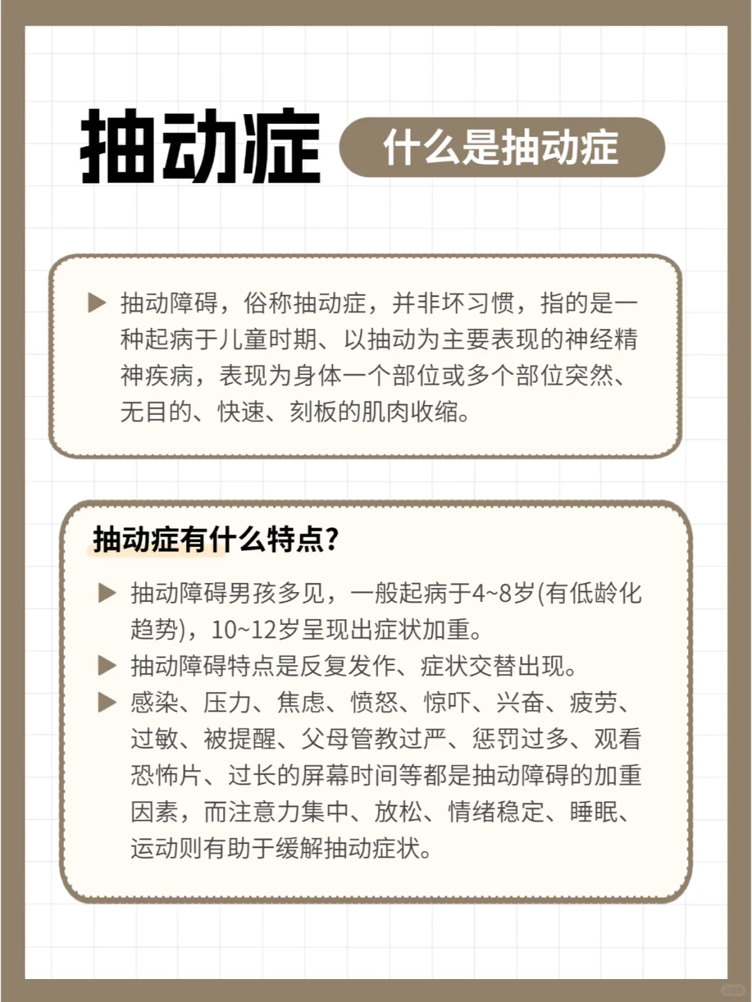 小儿抽动症是一种儿童时期起病的神经精神疾病,也被称为抽动秽语综合征其核心特征表现为不自主突发快速且重复的肌肉抽动,可能伴随爆发性发声或秽语症状表现抽动可累及全身多个部位,包括面部如眨眼皱眉颈部扭动肩部耸肩上肢甩手躯干扭腰及下肢踢腿等抽动的。
