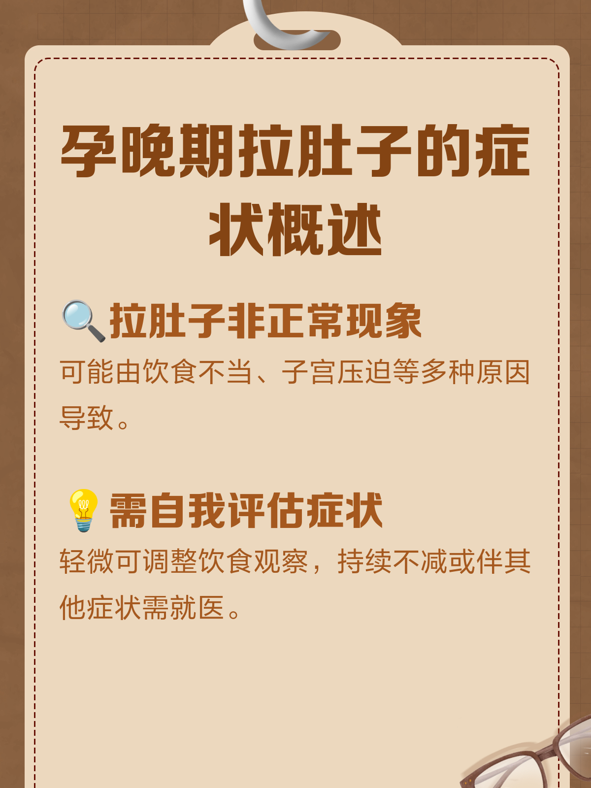 8、回答孕期要注意饮食的卫生,表面辛辣刺激,生冷的饮食,此外,还要注意休息,轻微腹泻的情况,休息后即可缓解,如果症状严重,出现脱水的话,就要尽早重视起来了!避免影响胎儿健康。