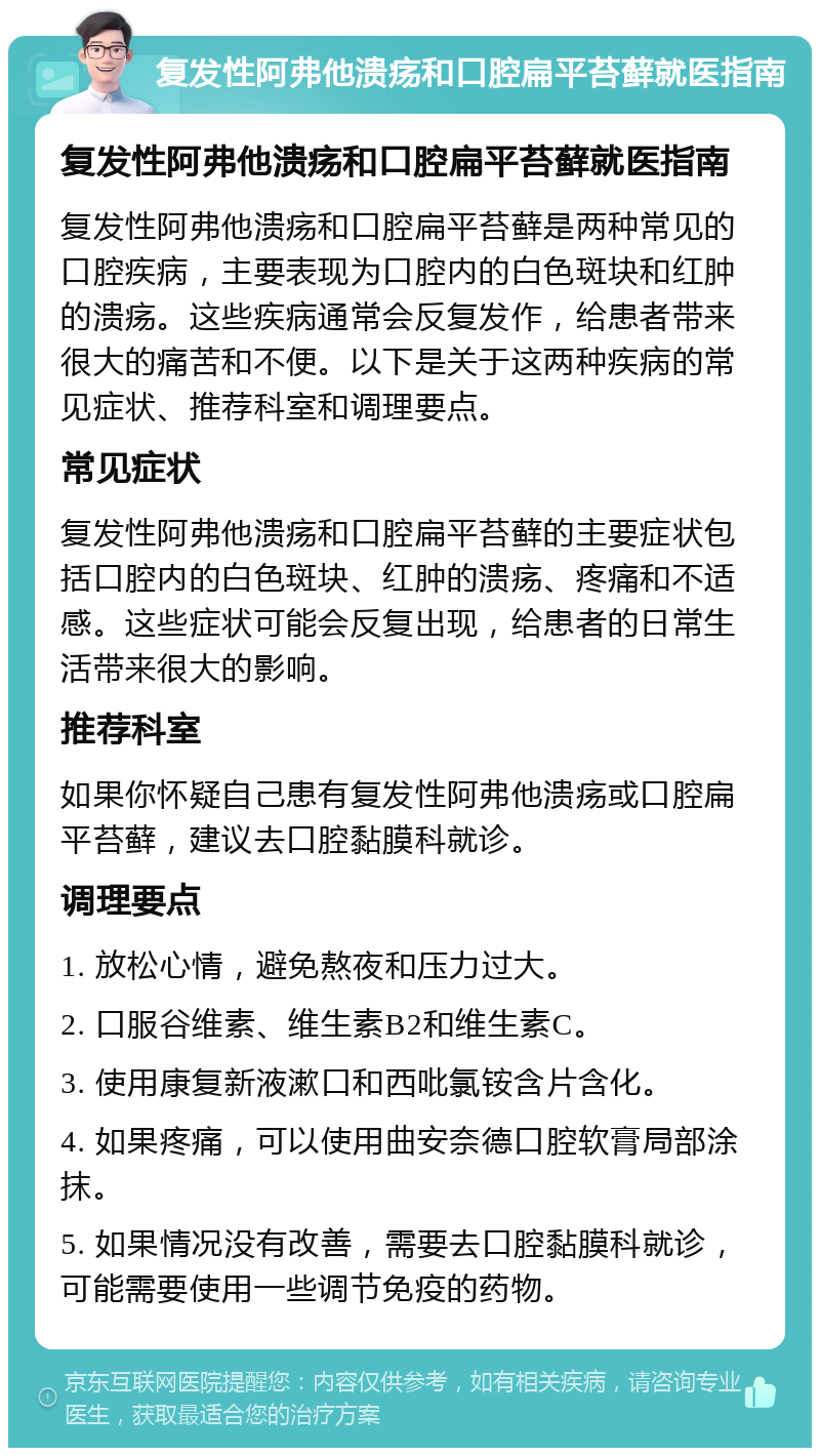 反复出现口腔溃疡可采取以下综合治疗措施一一般治疗需注重口腔卫生管理,每日使用软毛牙刷规范刷牙,餐后及时用淡盐水或清水漱口,避免使用尖锐餐具损伤黏膜饮食方面应严格限制辛辣过烫过硬食物摄入,减少对溃疡面的机械刺激同时需保持规律作息,避免熬夜导致免疫力下降,并通过运动冥想等方式缓解焦。