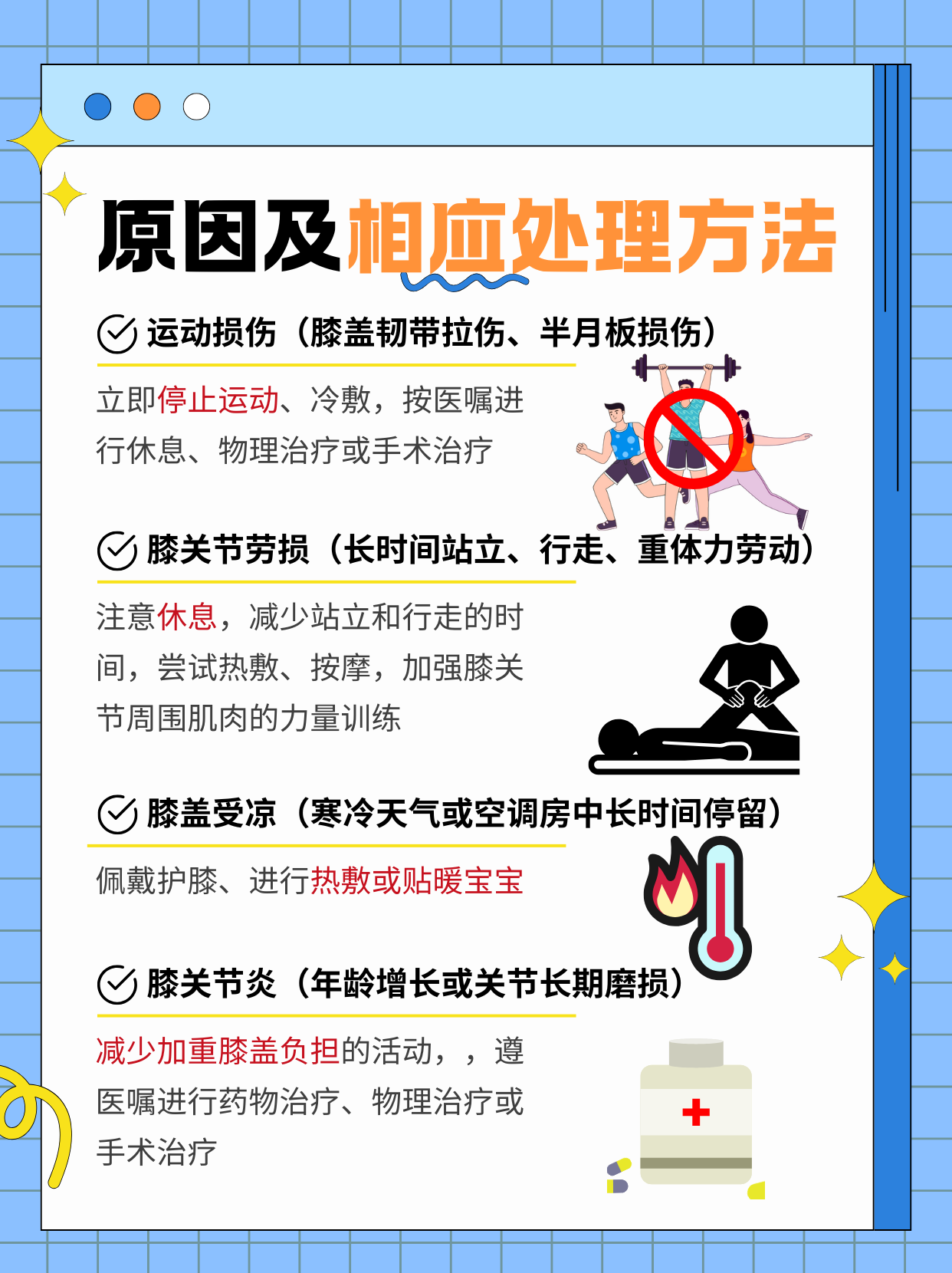 6 其他疾病因素感染如化脓性关节炎肿瘤如骨肉瘤或代谢性疾病如痛风也可能引发疼痛此外,系统性红斑狼疮银屑病等自身免疫病可能累及关节7 风险因素年龄增长关节退变肥胖增加关节负荷过度使用如长期跑步跳跃或运动损伤史均可能提高膝盖疼痛风险应对建议若疼痛持续;膝盖酸痛可能由以下原因引起,需根据具体情况进行判断和处理1 过度使用或受伤长时间跑步爬山或高强度运动可能导致膝盖过度负荷,引发酸痛扭伤韧带损伤或半月板破裂等外伤也会直接引起疼痛建议若因过度使用导致,需充分休息,配合冰敷急性期或热敷慢性期缓解症状若疼痛持续加重,或。