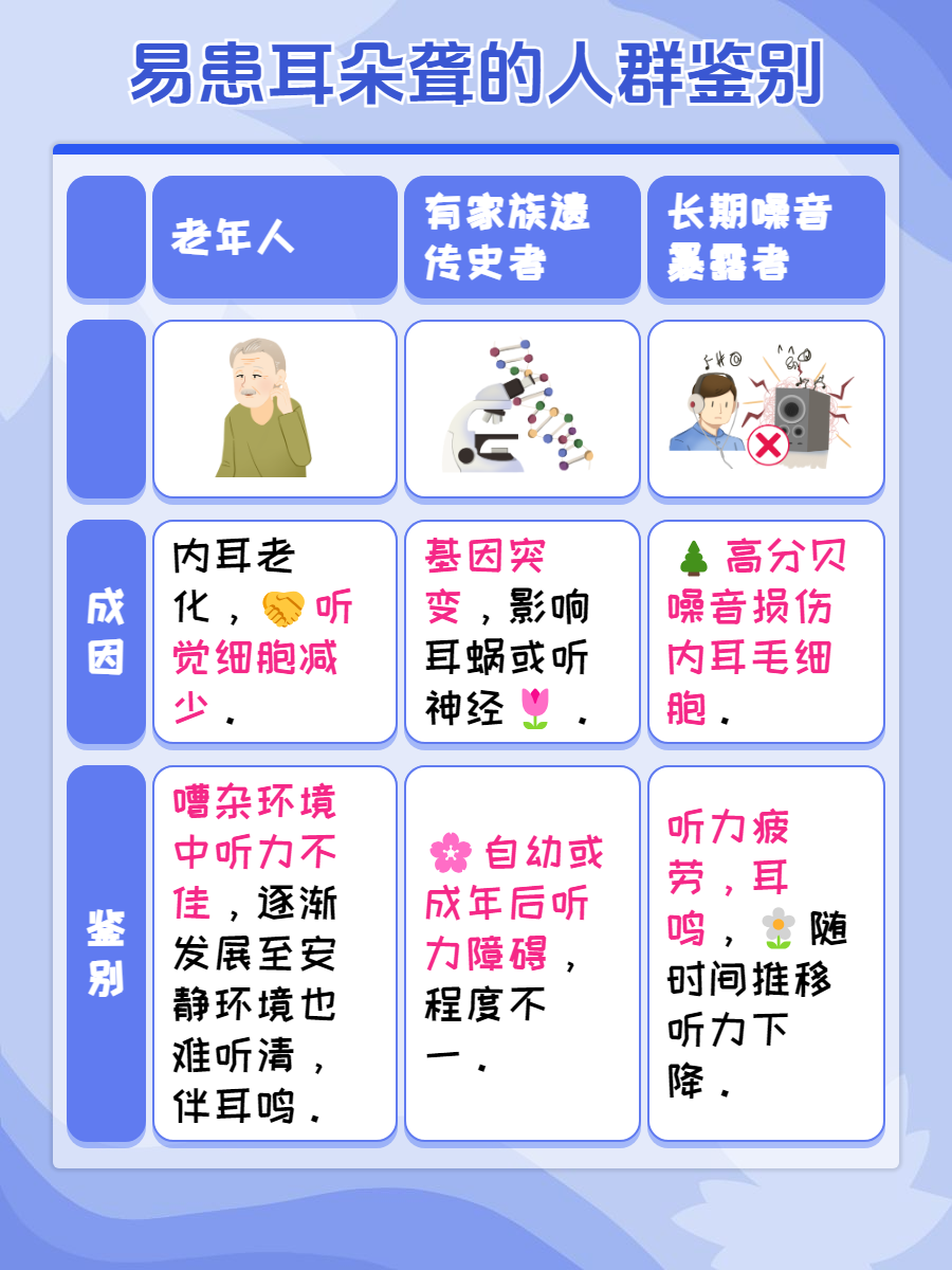 1、耳朵听不见的三种主要原因如下一外耳病变外耳道堵塞或异物阻塞是常见原因外耳道耵聍栓塞多因耵聍耳屎分泌过多或排出受阻,积聚成团阻塞外耳道,影响声音传导老年人因耵聍腺分泌旺盛且耳部肌肉松弛,更易发生经常游泳者外耳道进水后耵聍膨胀,也可能导致堵塞外耳道异物则多见于儿童因好奇塞。