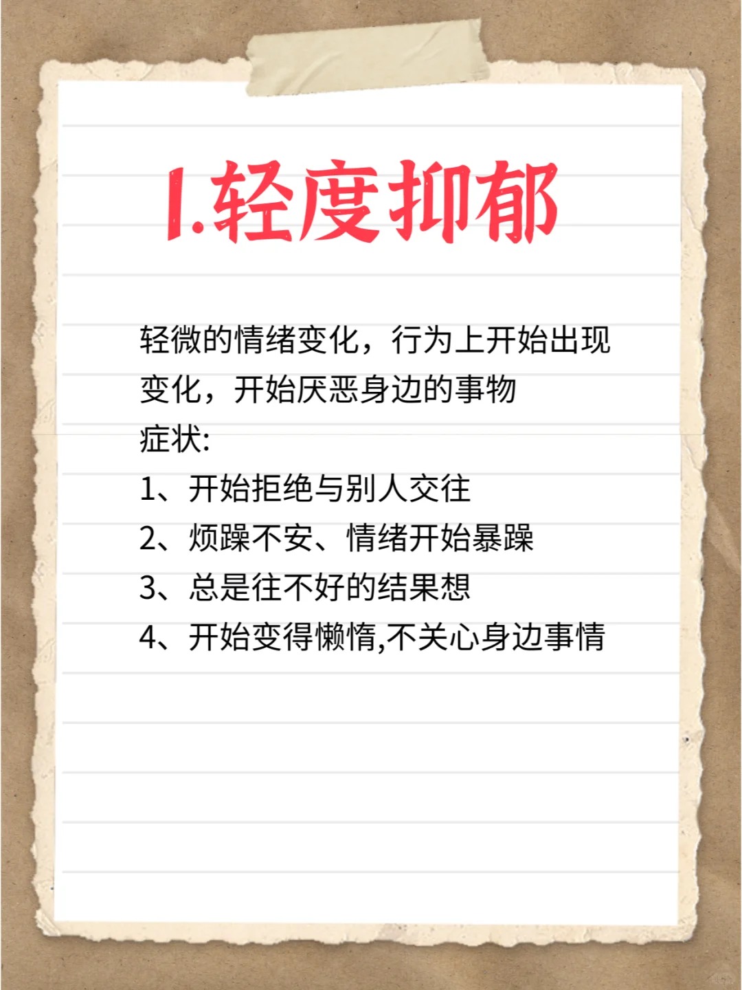 1、一不同程度的抑郁从轻微的精神痛苦到悲伤悲观和绝望 常常会感到心情沉重,生活无趣,不快乐,痛苦,无法自理有些人可能也会焦虑容易激动和紧张 二兴趣丧失是抑郁症患者的常见症状之一 失去以前生活和工作的热情和乐趣,对任何事情都没有兴趣无法体会家庭的幸福,不在乎过去的爱好,经常一个人住在封闭的;超过两周以上,甚至数月,则有可能属于抑郁症,需要进一步观察 严重程度正常的情绪低落程度一般较轻,不至于严重影响学习工作和生活,可自我调节缓解而抑郁症程度严重,并影响学习工作和生活,无法适应社会,可产生严重消极甚至产生消极自杀念头或行为,患者社会功能和生活质量明显下降 躯体症状抑郁情绪一般不伴随;青少年抑郁有哪些典型表现? 青少年抑郁症与成人抑郁症的表现差别很大与成人相比,以下症状在青少年中更为常见 易激惹或愤怒情绪对于青少年抑郁症患者来说,其情绪通常以易怒,而不是悲伤为主患抑郁症的青少年可能会脾气暴躁充满敌意,容易沮丧或暴怒 难以解释的躯体疼痛青少年抑郁症患者经常抱怨身体不适,如头;另外,几种常见的疼痛症状,如肌肉疼痛胃痛胸痛等,在精神患者中患病率分别为53%51%46%,但在健康人群中则低得多,分别为27%20%14% 研究显示,抑郁症患者伴有躯体性疼痛症状的患病率为65%重度抑郁症患者中伴有一种以上慢性躯体疼痛症状者高达434%,常见背部胃肠道关节肢体疼痛和头痛,而在其他;01轻度抑郁症轻微的抑郁会有情绪和行为的显著变化,有时身体的感觉也会增强常见的症状包括易怒想法消极感觉异常疲惫感觉绝望感到强烈的悲伤经常处于流泪的边缘自我厌恶难以集中注意力感觉没有动力想要独处无法解释的,身体轻微的疼痛对他人失去同情 02中度抑郁症当轻度抑郁得不到有效的控制,进一步发展成。