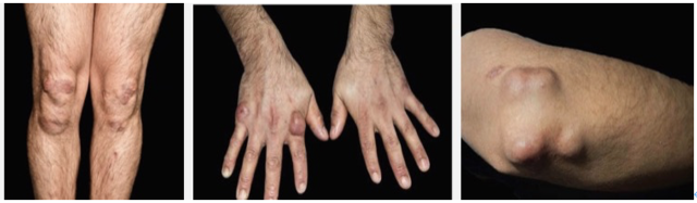 风湿性皮下结节它多为成批出现,于数日或数周内消失而类风湿结节多半或对称少数出现,持续数日数年不等结节性红斑常见于小腿伸侧的红色或紫红色疼痛性炎性结节,青年女性多见,病程有局限性,易于复发,发病前有感染史或服药史,皮损突然发生,为双侧对称的皮下结节,自蚕豆至核桃大不等,数目。