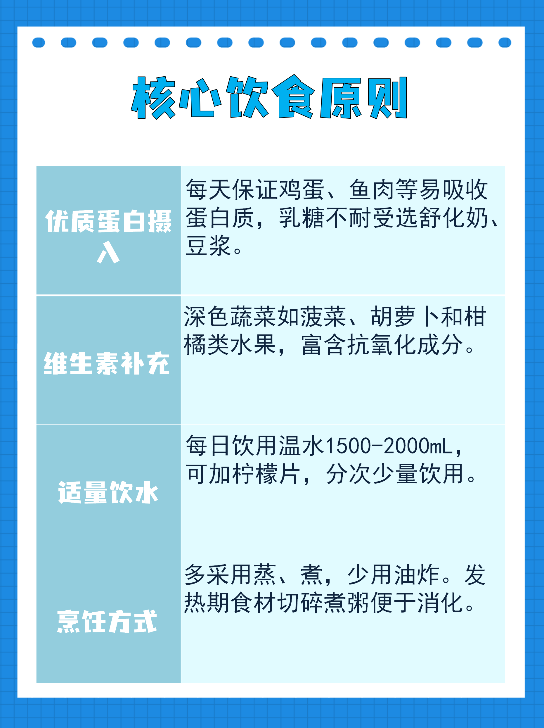 9、1 补充水分,预防脱水肺炎可能导致发热呼吸急促,增加身体水分流失每日饮用15002000毫升温水,或通过淡茶清汤补充,有助于稀释痰液缓解呼吸道干燥2 摄入优质蛋白质,促进修复蛋白质是免疫细胞合成和受损组织修复的关键营养素优先选择易消化的优质蛋白如清蒸鱼肉去皮鸡肉豆腐鸡蛋羹等。