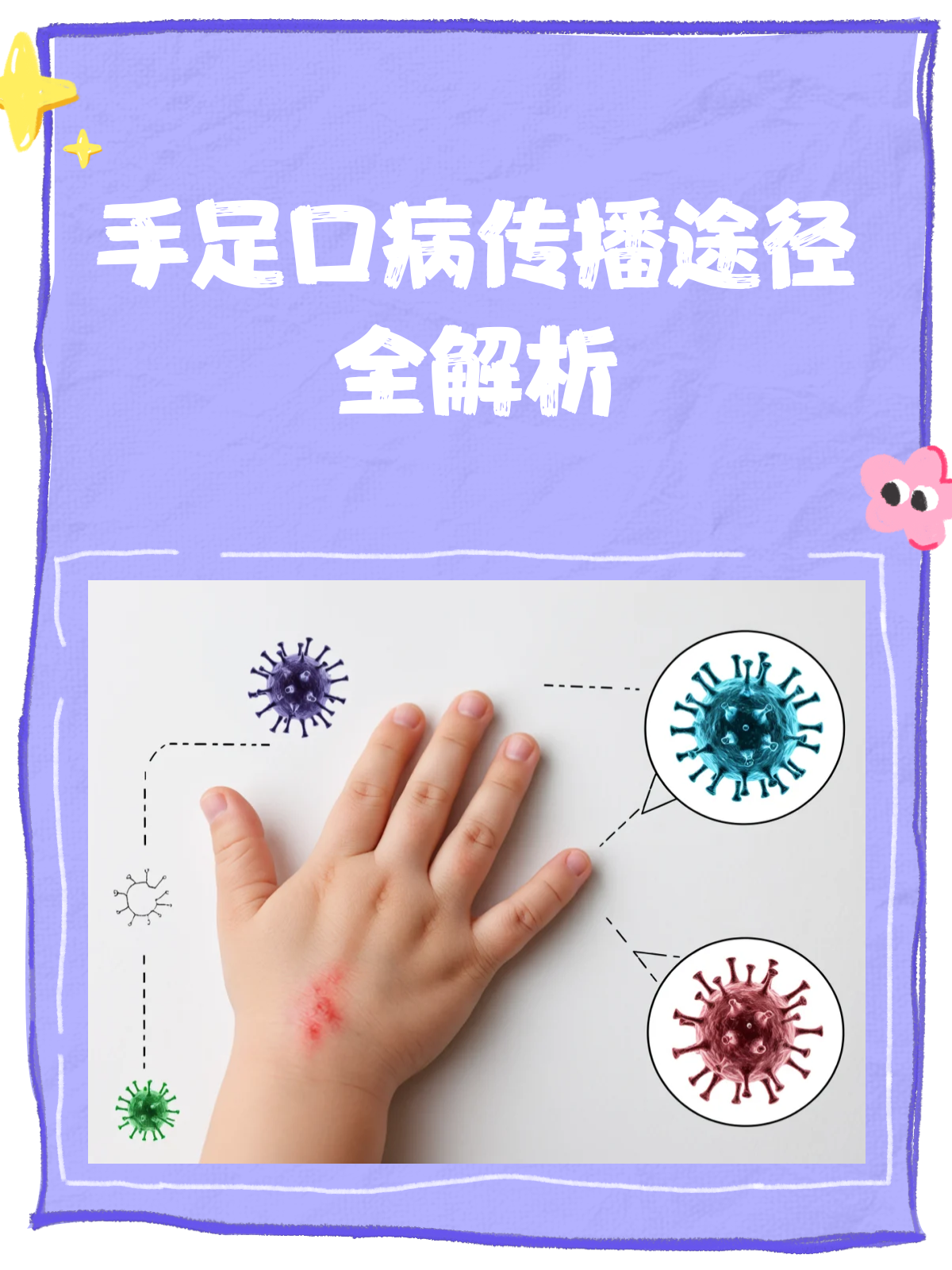 6、手足口病主要通过以下三种途径传染1 密切接触传播这是手足口病最主要的传播方式患者的疱疹液唾液粪便中含大量病毒,健康人群接触被污染的物品如手毛巾玩具餐具床上用品等后,病毒可通过口鼻眼等黏膜侵入体内例如,儿童共用玩具后未洗手直接进食,易引发感染2 飞沫传播患者。