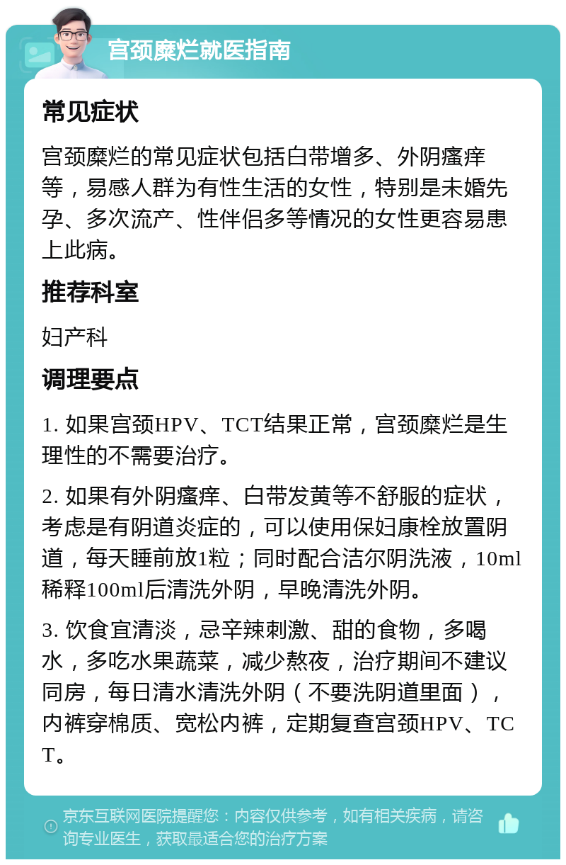 治疗方面需根据病情严重程度患者年龄及生育需求综合选择方案药物治疗多用于轻度宫颈糜烂,对2度效果有限,仅能缓解症状物理治疗如激光冷冻微波是2度宫颈糜烂的主要手段,通过破坏异常上皮组织促进再生手术治疗如宫颈锥切术仅适用于糜烂范围大反复发作或合并癌前病变的患者治疗期间需严。