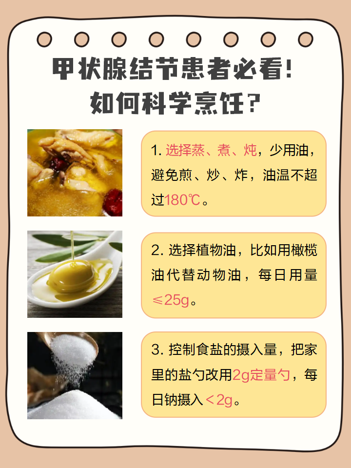2 补充维生素与膳食纤维维生素C维生素E及B族维生素具有抗氧化作用,可保护甲状腺细胞推荐多吃新鲜蔬果,如猕猴桃苹果橙子菠菜西兰花等膳食纤维能促进肠道蠕动,帮助代谢废物排出,间接减轻甲状腺负担3 科学控制碘摄入量碘摄入需根据病因调整碘缺乏型结节可适量增加海带紫菜等含碘食物,但需避免。