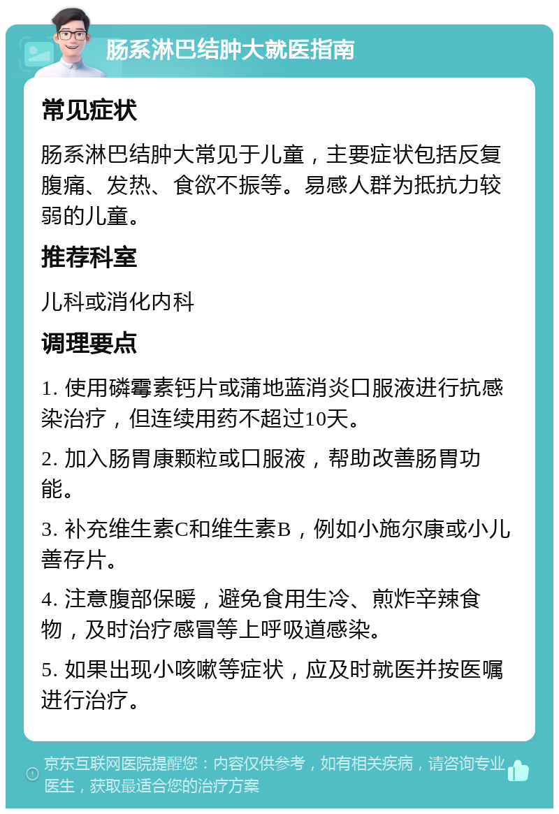 2、儿童肠系膜淋巴结炎需通过规范治疗家庭护理及预防措施综合管理,具体如下一治疗方法1一般治疗以休息和饮食调整为主患儿需保证充足睡眠,避免剧烈运动饮食应清淡易消化,优先选择米粥面条蒸煮蔬菜等,忌食辛辣油腻生冷及刺激性食物,减少对肠道的刺激2药物治疗需根据病因用药若;小儿肠系膜淋巴结炎的治疗需结合病因症状及患儿个体情况,综合采取以下措施一治疗方法1一般治疗以休息和饮食调整为主患儿需卧床休息以恢复体力,同时补充水分如温开水维持水盐平衡饮食应选择清淡易消化的食物,如米粥面条,避免辛辣油腻刺激性食物,减轻肠胃负担2抗感染治疗;儿童肠淋巴结炎的治疗需根据病因和症状进行个体化处理,具体方法如下一一般治疗1休息患儿需减少活动量,保证充足睡眠,避免剧烈运动加重肠道负担2饮食调整以清淡易消化食物为主,如米粥面条等避免辛辣油腻生冷食物及高糖饮料,减少对肠道的刺激3水分补充鼓励患儿少量多次饮水;五特殊人群管理1婴幼儿症状可能不典型如仅哭闹拒食,需通过腹部超声确诊,治疗更需谨慎2过敏体质用药前告知医生过敏史,避免使用可能致敏的药物如青霉素类3基础疾病患儿如免疫缺陷慢性肾病等,需在儿科医生指导下调整治疗方案总结肠系膜淋巴结炎多为自限性疾病,但需。