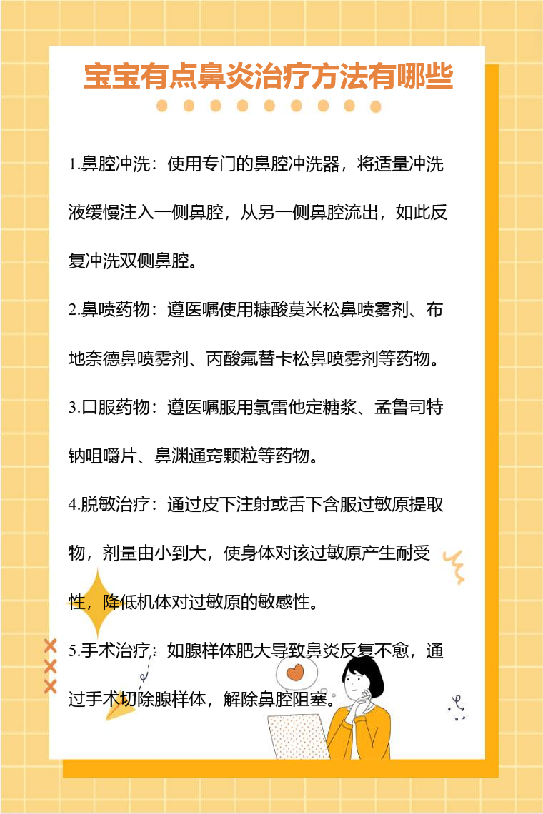鼻炎的治疗方法需根据具体症状病因及严重程度综合选择,主要分为药物治疗静脉输液治疗和手术治疗三大类,具体如下一药物治疗药物治疗是鼻炎最常用的治疗方式,通过不同作用机制的药物缓解症状控制炎症或改善鼻腔功能,具体包括以下类型鼻用糖皮质激素如布地奈德鼻喷雾剂糠酸莫米松鼻喷雾剂等。
