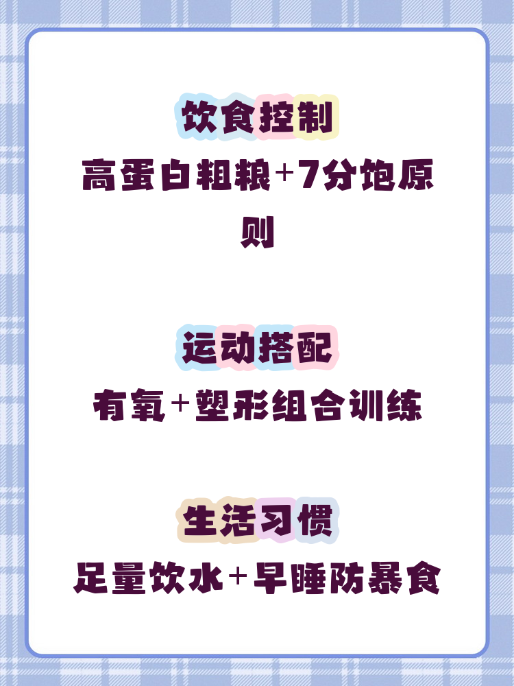 力量训练如举重俯卧撑深蹲等,则能增加肌肉量,而肌肉量的提升会提高基础代谢率,使身体在静息状态下也能消耗更多热量两者结合可实现“减脂+塑形”的双重效果合理饮食需控制热量摄入并保证营养均衡瘦身的本质是“热量缺口”,即每日摄入的热量需低于身体消耗的热量,迫使身体分解脂肪供能可通过。