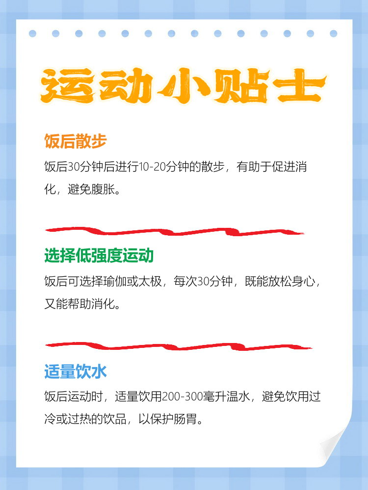 轻度运动 饭后半小时是轻度运动的最佳时机,如散步瑜伽或缓慢的拉伸练习等 此时身体已有时间处理食物,进行轻度运动不会干扰消化过程,有助于促进身体健康剧烈运动 饭后两小时是进行剧烈运动的合适时间,如跑步游泳等高强度运动 此时身体已充分消化食物,能够确保运动时有足够的能量输出,同时。
