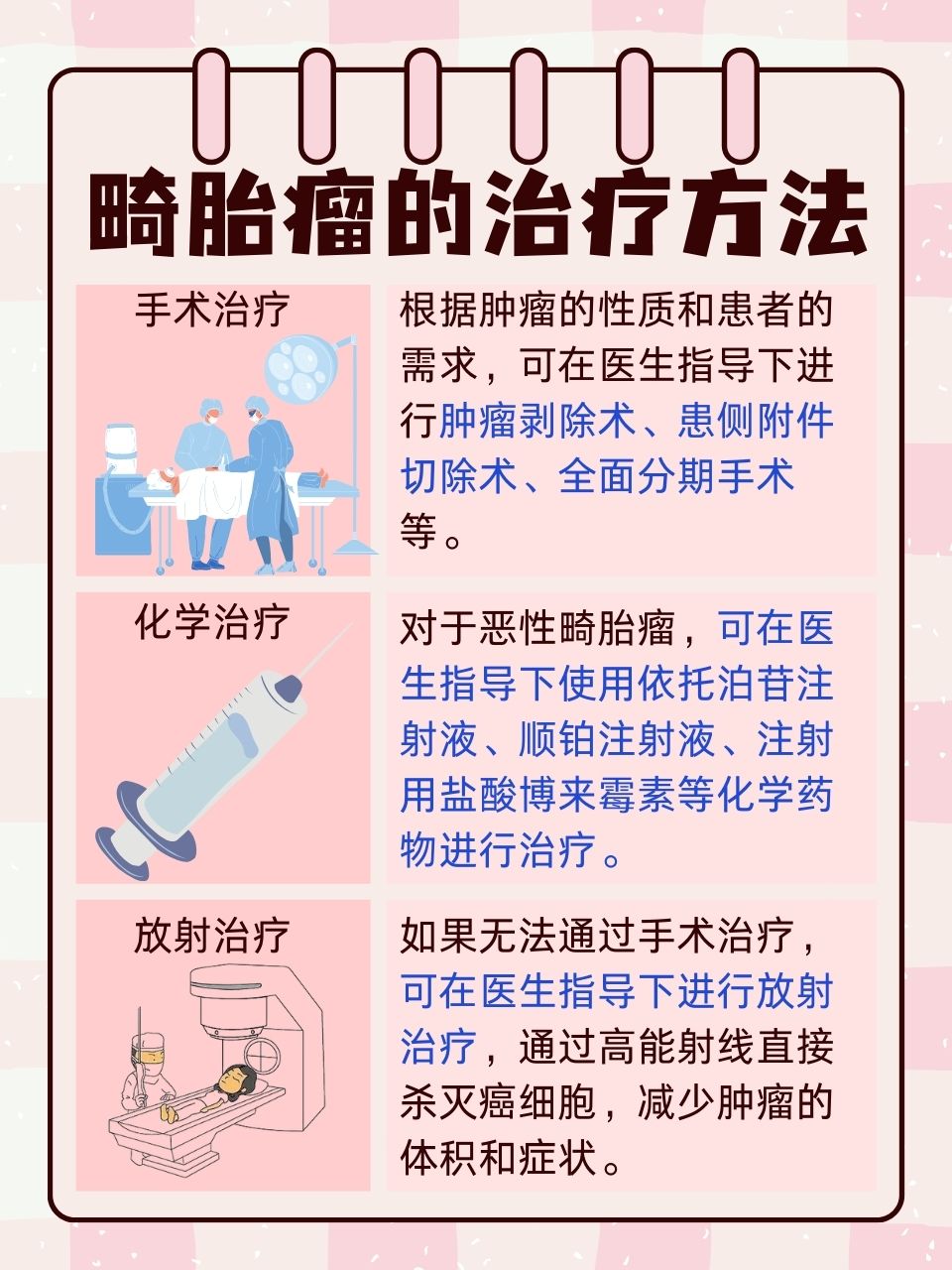 导致畸胎瘤的发生尽早就医如果已经被确诊为畸胎瘤,应尽快就医,以便医生根据具体情况制定合适的治疗方案早期发现和治疗有助于提高治愈率和减少并发症综上所述,畸胎瘤的发病与遗传突变有关,即使没有怀孕史,也有可能患病因此,建议女性定期进行妇科检查,以便及时发现并治疗相关疾病;治疗后不影响生育但是该病的复发率高,与未化疗或采用的化疗药物及方法不恰当有关系,复发分布为大多数在盆腔及腹腔内畸胎瘤和怀孕有关系吗? 畸胎瘤和怀孕,是没有任何关系的,导致畸胎瘤的出现,其实就是因为女性在平时的时候容易生气,长时间以来也会让身体内的各个激素得到改变,还会出现一些疾病的对女性的危害;直径小于5厘米时影响有限,超过5厘米怀孕概率可能下降未成熟畸胎瘤是恶性肿瘤,治疗需手术化疗等综合手段,手术可能破坏卵巢组织影响盆腔结构,化疗药物可能对卵巢功能产生不可逆损伤,导致卵巢早衰,极大降低怀孕可能性畸胎瘤患者怀孕后存在相关情况孕期随着孕周增加,子宫增大可能改变畸胎瘤位置,增加蒂。