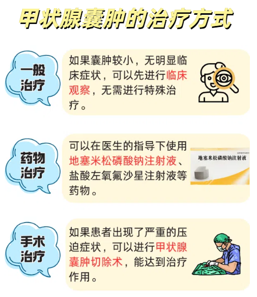 5、无需手术的情况当甲状腺囊肿体积较小,如直径小于23厘米,且患者无任何不适症状如颈部压迫感呼吸困难吞咽困难等时,通常无需立即手术此时可通过超声等检查手段定期随访每36个月复查,观察囊肿大小形态变化若囊肿经超声穿刺细胞学检查明确为良性,且无恶变倾向如短期内未迅速增;手术方式包括单纯囊肿切除或部分甲状腺切除,术后需定期复查甲状腺功能及超声,预防复发或甲减4 病因治疗若囊肿由基础疾病引发如桥本甲状腺炎,需针对原发病治疗例如,桥本甲状腺炎患者可能需长期服用左旋甲状腺素替代治疗,以调节免疫反应稳定甲状腺功能,间接控制囊肿发展特殊人群注意事项 孕妇哺乳;甲状腺囊肿的治疗需根据病情严重程度选择合适方案,具体如下1 观察与定期复查对于无症状的甲状腺囊肿,通常无需特殊治疗,但需定期进行医学检查检查内容包括超声检查甲状腺功能检测等,以监测囊肿大小形态及功能变化建议每612个月复查一次,若囊肿稳定无进展,可继续观察2 手术治疗当囊肿持续。