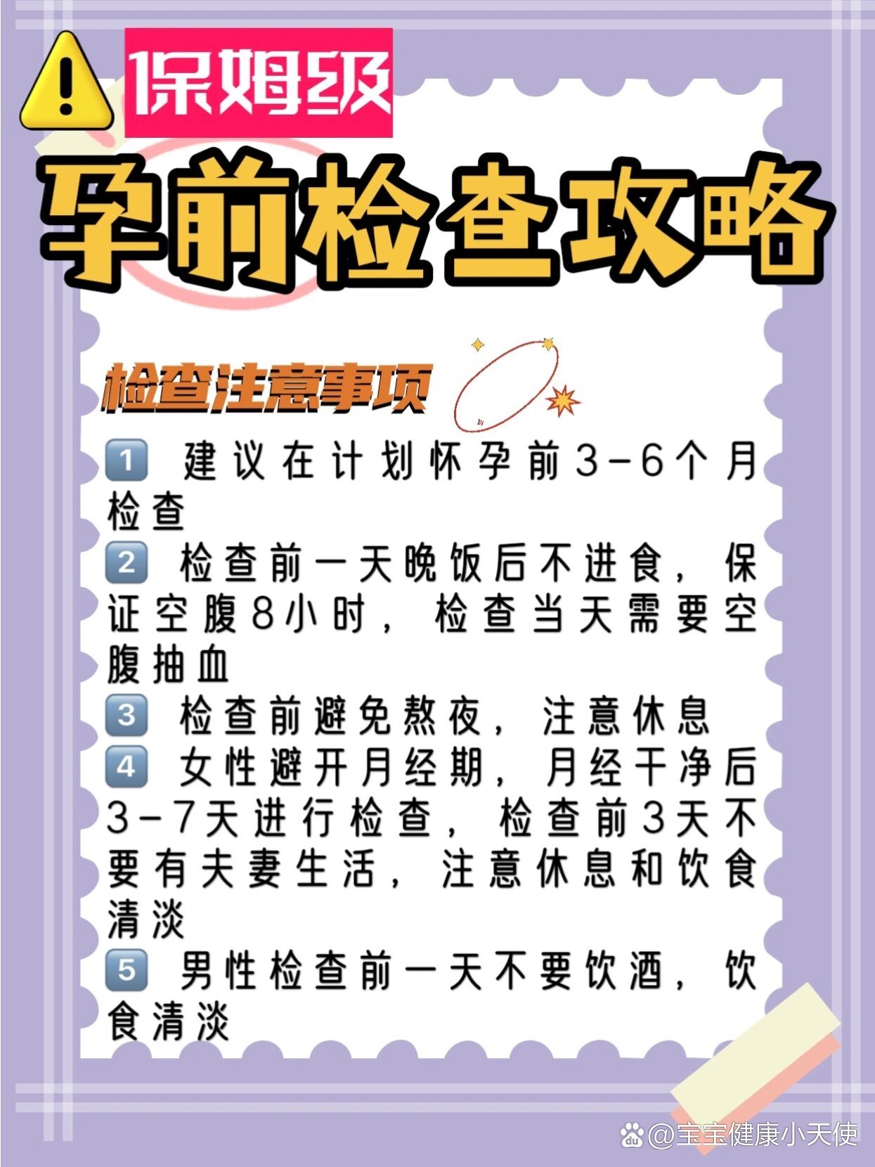 2、甚至导致流产早产等危险7白带常规 筛查滴虫霉菌细菌的感染,如果患有性传播疾病,最好是先彻底治疗,然后再怀孕否则会引起流产早产胎膜早破等危险8染色体检测 及早发现克氏征特纳氏综合症等遗传疾病不育症9全身体格检查 全身检查及生育能力评估;怀孕前需进行女性常规检查男性相关检查优生四项检查妇科超声检查及遗传咨询相关检查,以全面评估夫妻双方身体状况,发现并干预影响怀孕及孕期母婴健康的因素具体如下女性常规检查 血常规了解血红蛋白水平,排查贫血贫血可能导致孕期机体供氧不足,影响胎儿发育一般女性血红蛋白值应在110gL150g。