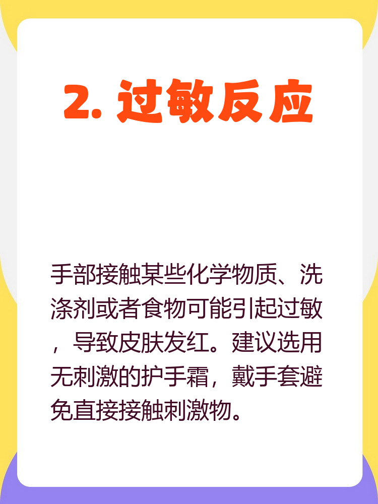 1 生理原因导致的红手红手可能是由于血液循环加快,使得手掌出现潮红这种情况通常是无害的,可能在运动紧张或受到刺激后出现此外,某些药物反应也可能导致手掌发红2皮肤疾病引起的红手某些皮肤病如过敏性皮炎接触性皮炎等,也可能导致手掌发红这些皮肤病可能伴随着其他的症状,如瘙痒肿。
