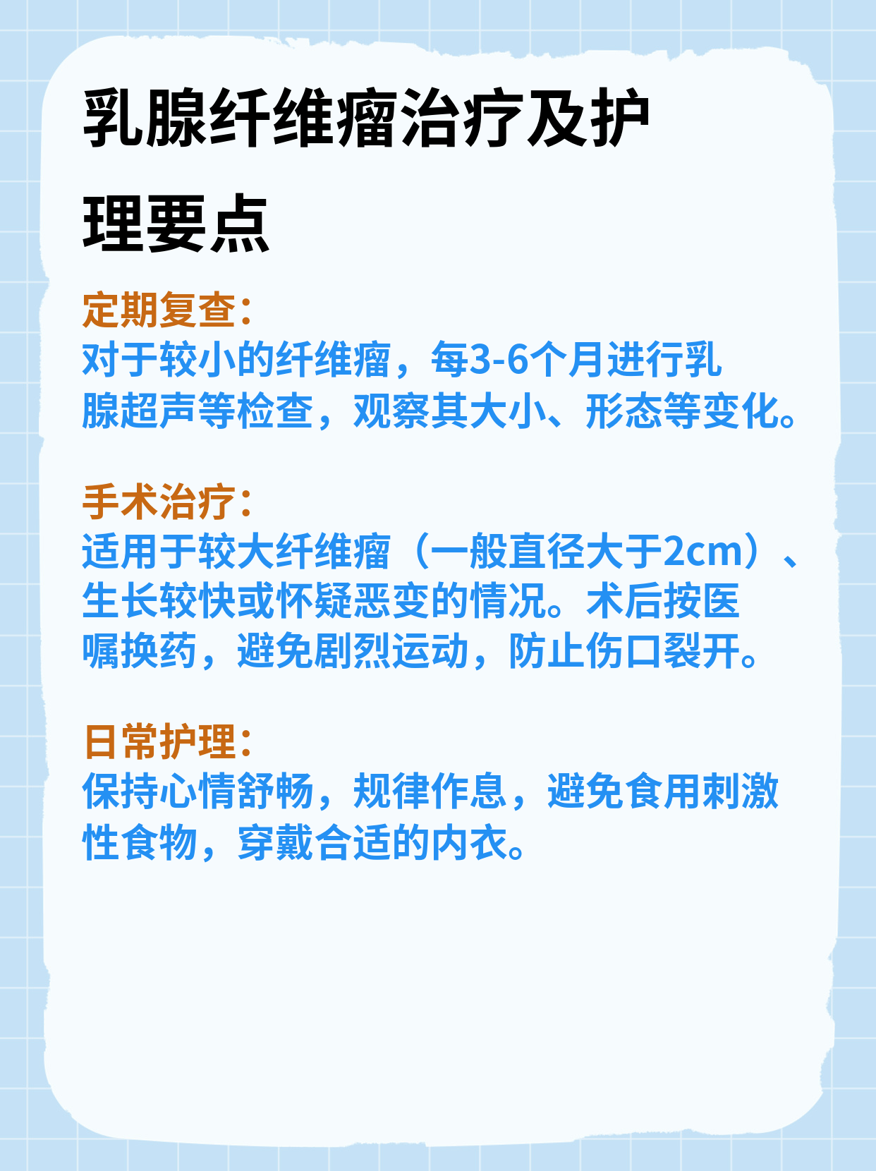 乳腺纤维瘤的治疗需根据肿瘤大小症状患者年龄等因素综合决定,具体如下1观察随诊若纤维瘤较小2厘米以下无症状,且生长缓慢,可选择定期观察建议每36个月复查一次乳腺超声,监测肿瘤大小变化此方法适用于年轻未婚或未育患者,可避免手术对乳房外观的影响2手术治疗当纤维瘤大于2。