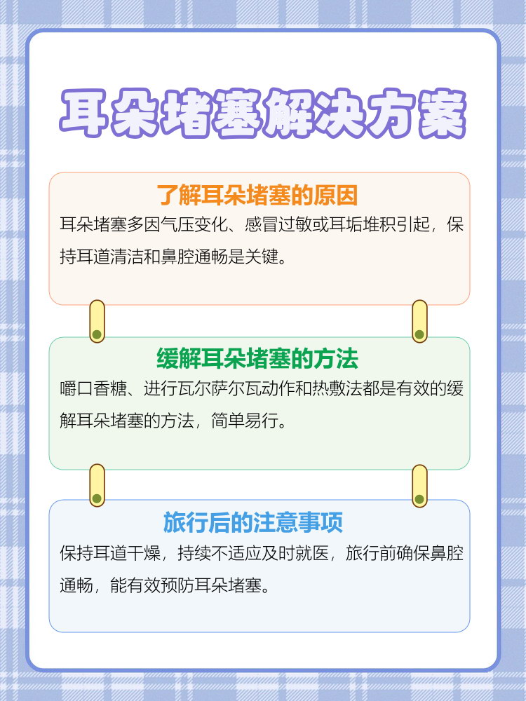 2、耳朵胀胀的堵住的感觉即耳闷感,其成因需结合具体病因分析耳道内耵聍栓塞或异物阻塞外耳道内的耵聍耳屎过度堆积形成栓塞,或异物如棉签头小昆虫误入耳道,会直接堵塞耳道空间,阻碍声波传导,导致耳闷感此类情况通常伴随听力下降耳道瘙痒或疼痛,通过耳镜检查可明确阻塞位置及性质中耳炎症性;右耳好像堵住了一样,可以采取以下措施判断病因卡他性中耳炎这种情况多见于上呼吸道感染,由于咽鼓管充血肿胀,导致空气不能进入鼓室,形成负压,进而感觉耳朵被堵住耵聍栓塞耳垢过多或过硬,也可能导致耳朵被堵住的感觉针对卡他性中耳炎的治疗积极治疗上呼吸道感染这是治疗卡他性中耳炎的根本药物治疗;感觉耳朵被堵住了,可以采取以下措施1 及时就医检查 耳朵被堵住可能是由多种原因导致的,因此需要及时到医院对耳部进行详细的检查,以便确定具体的原因2 清理外耳道 如果是因为外耳道内耵聍团块堵塞导致的堵塞症状,可以通过对耳道的清理来改善不适症状3 治疗分泌性中耳炎 如果确诊为分泌性中耳;耳朵有堵住的感觉怎么治疗耳朵有堵住的感觉,治疗方法因病因不同而有所差异,具体如下耵聍栓塞若堵塞由耵聍栓塞引起,可尝试改变体位如轻轻倾斜头部,帮助松动耵聍使用滴耳液如碳酸氢钠滴耳液软化耵聍。