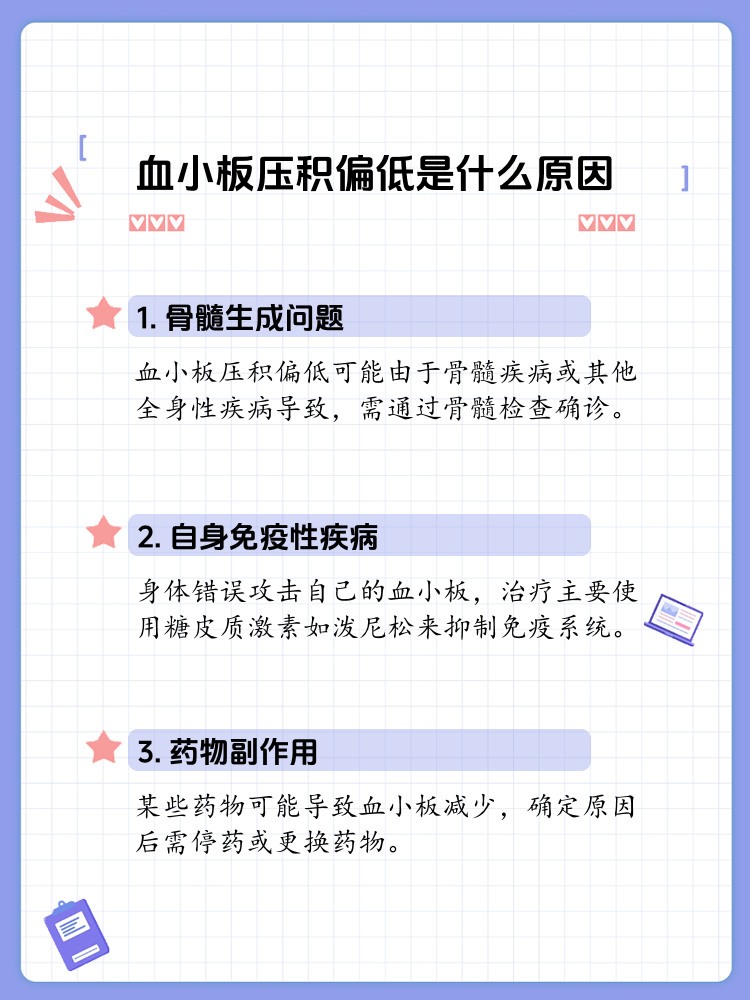 3 药物治疗预防血栓若血小板过高导致血栓风险如动脉或静脉血栓,医生会开具抗血小板药物如阿司匹林或抗凝药物如华法林利伐沙班,以减少血小板聚集和血栓形成用药期间需定期监测凝血功能,避免出血风险4 调整生活方式 饮食增加蔬菜水果全谷物摄入,减少高脂肪高盐高糖食物适量。