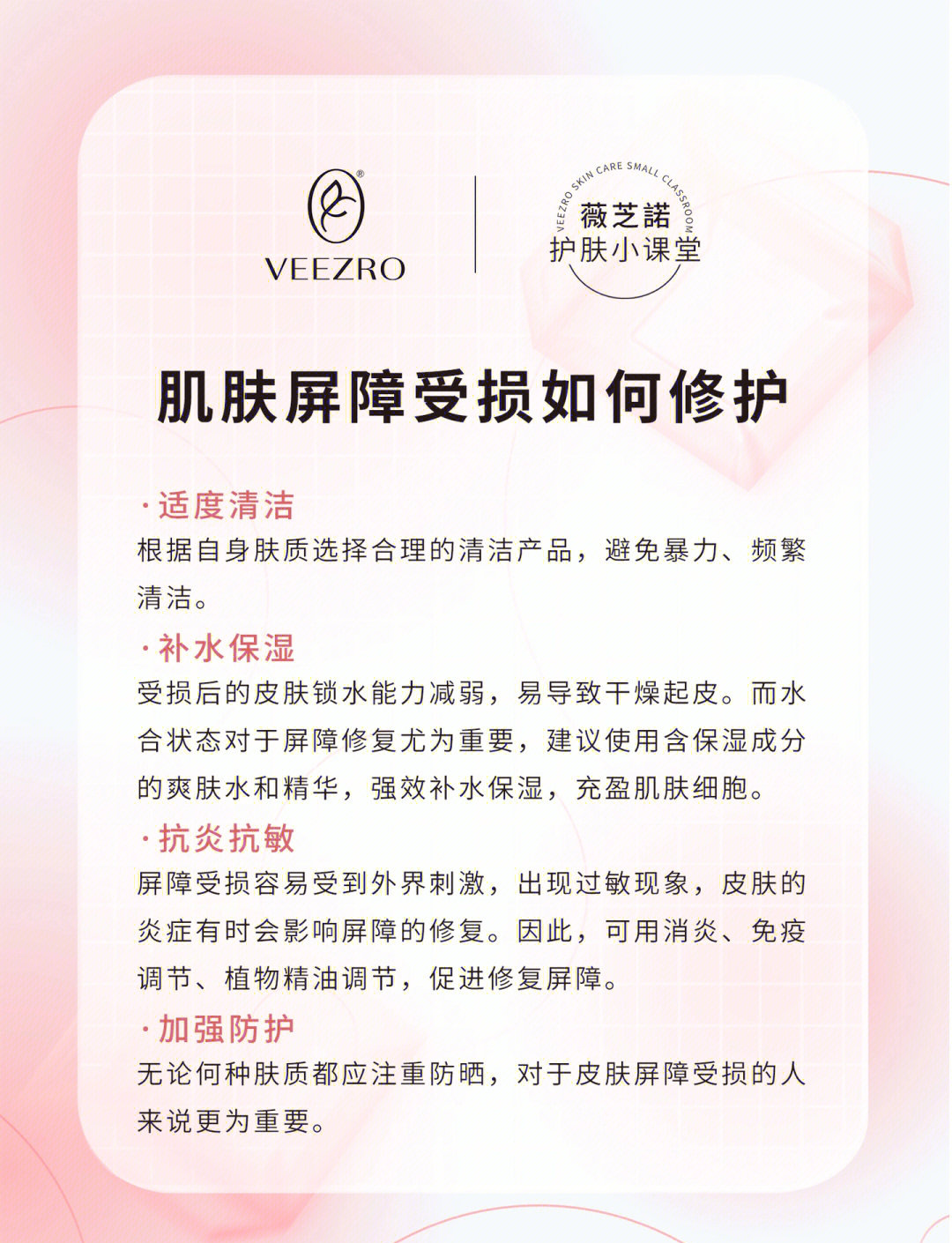 屏障受损导致敏感肌的修复需从避免损伤因素使用含修复成分的护肤品及调整生活习惯三方面入手具体如下一避免屏障进一步受损的行为停止过度清洁每日洗脸不超过2次,避免使用含皂基的强力清洁产品,减少去角质频率每周不超过1次过度清洁会剥脱角质层,破坏皮肤屏障的完整性,导致水分流失干燥。