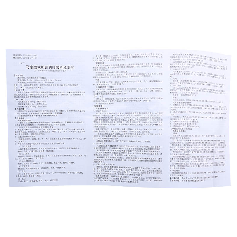 马来酸依那普利叶酸片,其实里面的成分主要就是依那普利加叶酸,它比普通的依那普利多了叶酸成分它的功效主要是用来控制血压,效果还是非常的好,它属于是ACEI类的降压药物,属于是非常好非常成熟药效非常稳定的一类降压药但是它里边含有叶酸成分,叶酸主要是用来补充叶酸的因为有些人高血压。