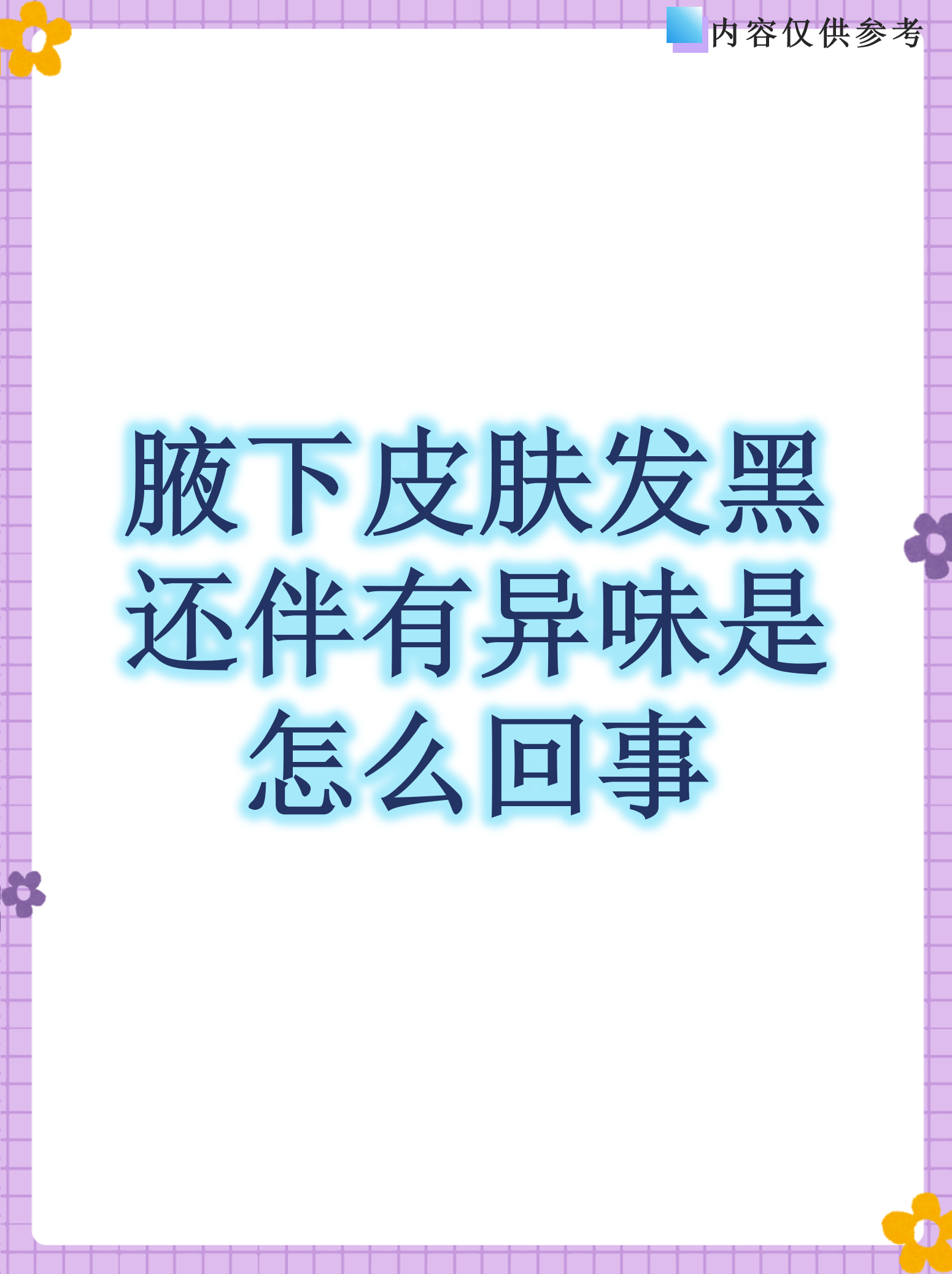 腋下发黑的原因有多种,主要包括以下几点1 黑棘皮病 肥胖性黑棘皮病由于肥胖,腋窝部皮肤反复摩擦刺激,加之内分泌异常,可以导致腋窝部皮肤颜色明显发黑,通常皮肤表面还有增生性改变2 局部慢性炎症 炎症性疾病腋窝局部存在慢性炎症性疾病时,如皮肤癣病间擦疹湿疹或真菌感染等。