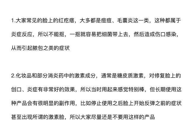 2. 化妆品和部分消炎药中的激素成分,通常是糖皮质激素,对修复脸上的创口、炎症有非常好的效果,所以当时用起来感觉特别棒,但长期使用这种产品会有很明显的副作用,比如停止使用之后脸上开始反弹之前的症状,甚至出现所谓的激素脸,所以大家尽量还是不要用这样的产品