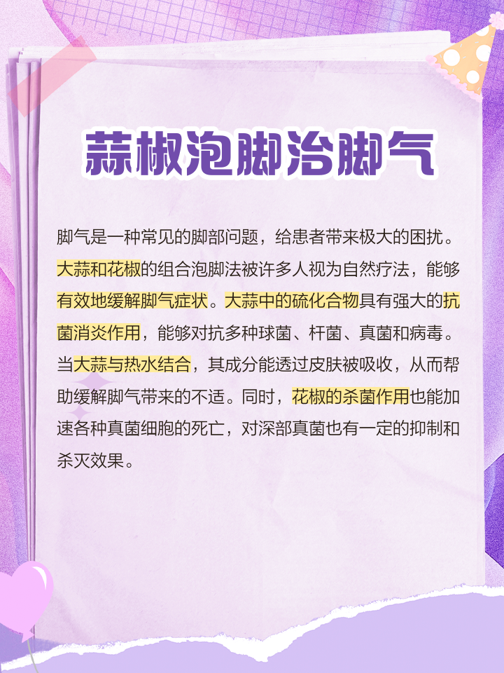6、2治病原理大蒜中的营养成分,具有很强的杀菌作用,可以在泡脚的过程中深入的渗透到脚步肌肤里,起到很好的杀菌效果,而且食盐温水的作用,可以提高脚部的血液循环效率,进而可以防治各种脚部疾病3防治疾病大蒜泡脚可提高脚部的抗病能力可以治疗脚气炎症脚臭等疾病,还可以消除脚部的疲劳感4。