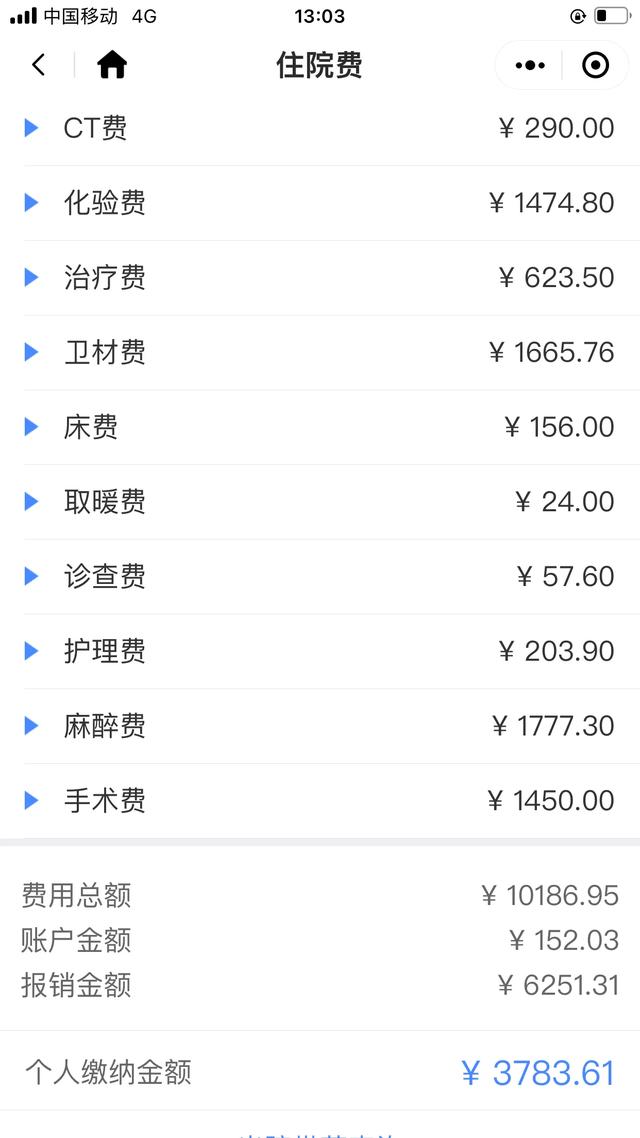 4.从入院到出院整体历时4天,费用10186.95,医保报销6251.31,自费3783.61(还有个150元左右从医保账户余额中扣除),术后建议休息1个月(自我估计元旦过后即可返岗了)。
