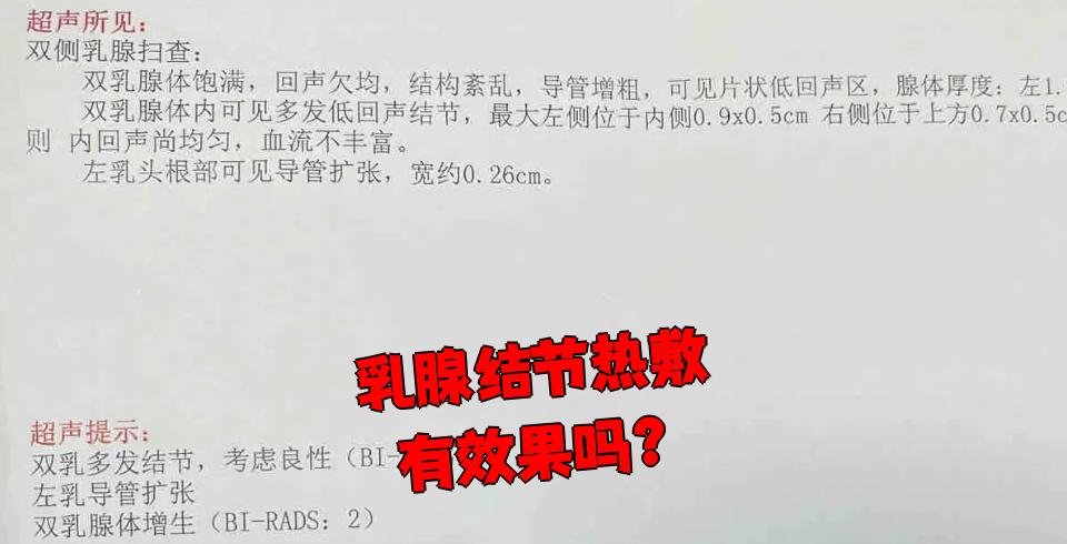 乳腺结节的患者用热敷并没有帮助,对于乳腺结节的治疗,首先要明确诊断,比如做超声或者做钼靶摄片等检查,明确结节的性质以后再考虑下一步的治疗方法,具体如下1良性结节乳腺纤维腺瘤等可以考虑保守治疗定期复查,注意清淡饮食,不能够吃辛辣刺激的食物,不建议通过热敷或者按摩等方法处理,因为有。