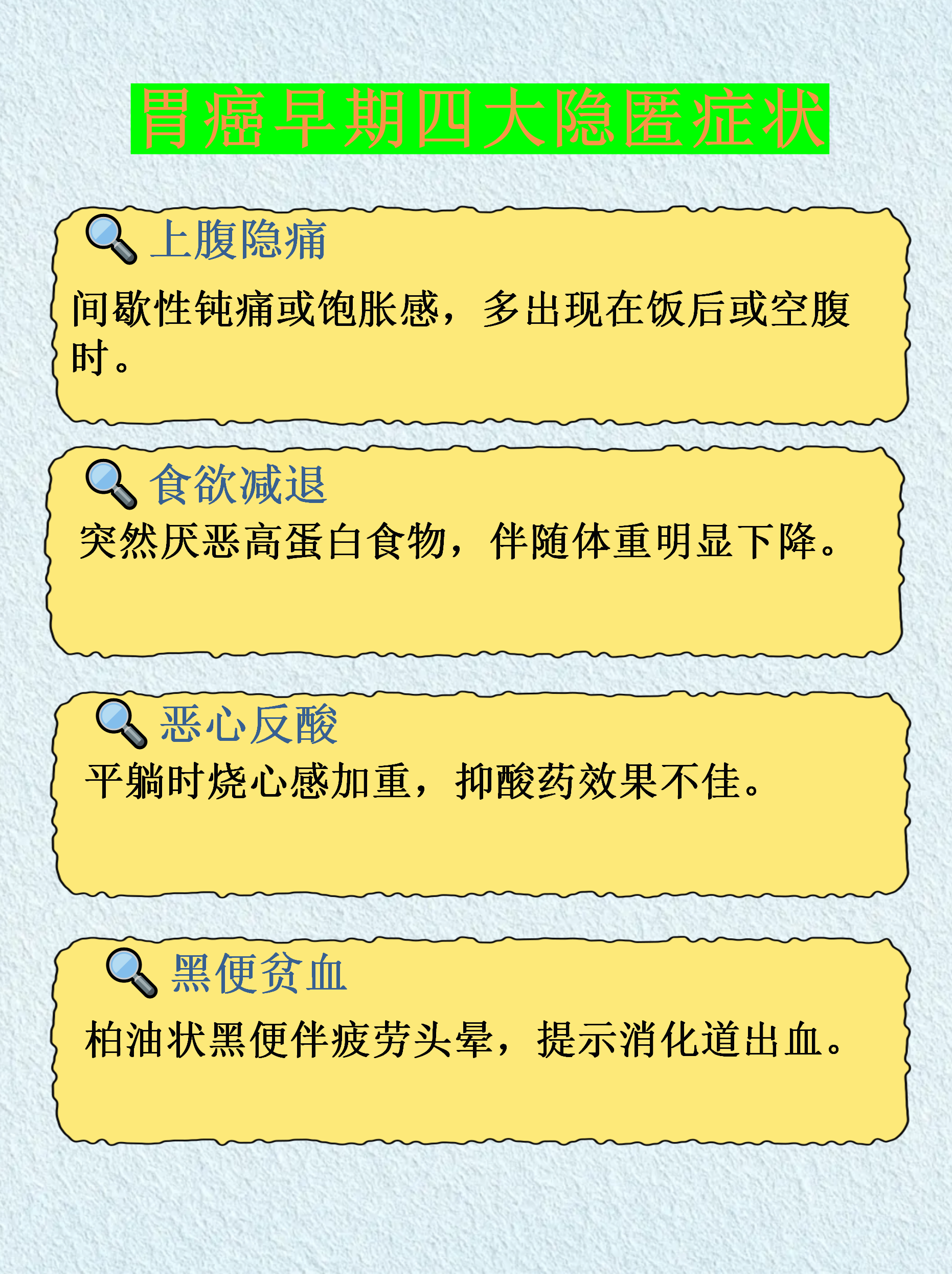 女性胃癌早期症状主要包括以下方面一消化道症状1消化不良表现为上腹部饱胀不适或隐痛,无规律性且与饮食关联弱,可能进食少量食物即有饱腹感,或进食后上腹部隐痛持续不缓解约半数早期胃癌患者存在此类症状,易被误认为普通胃病或饮食不当而忽视2食欲减退患者对食物兴趣降低,食量明显减少。