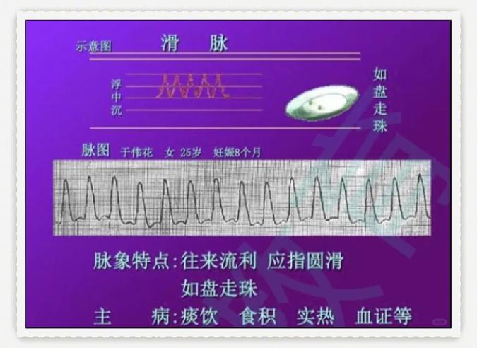 1滑脉就手放在手腕脉搏跳动的地方手底下的感觉比较圆滑,有种算盘珠在盘中滚动的感觉2见于健康的青壮年男性,其脉滑,而且和缓从容比较有力量3可以见于怀孕的妇女,脉滑而且脉搏跳的比较快4可以见于一些体内有痰浊痰湿的人,还会伴有形体肥胖喉中有痰5可以见于一些食积的人,因吃。