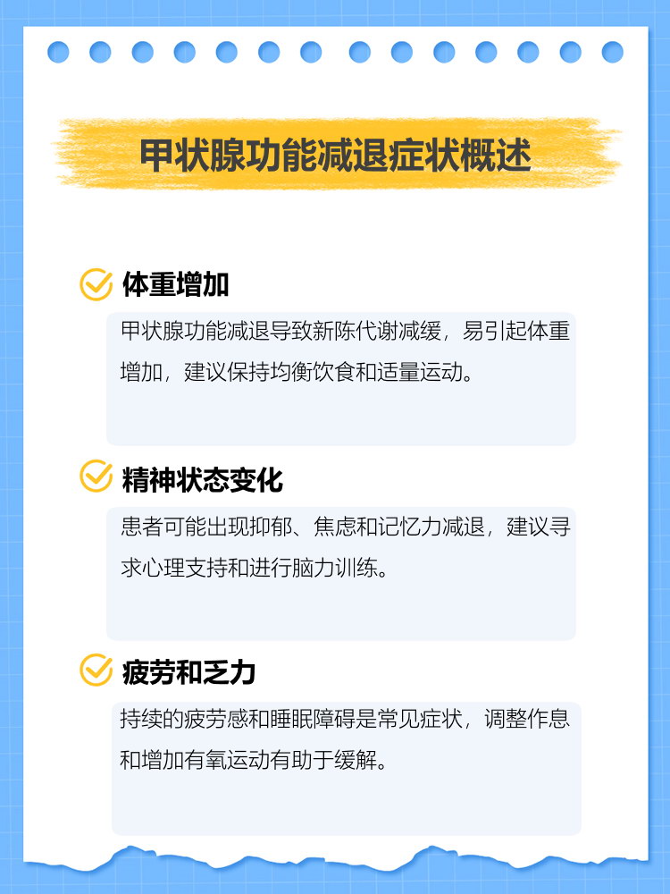 13、甲状腺甲减即甲状腺功能减退症,其症状可归纳为以下四个方面1 代谢减慢患者因甲状腺激素分泌不足,导致基础代谢率降低典型表现为畏寒,即使在温暖环境中也易感到寒冷,这是由于身体产热能力下降同时,患者常感到全身乏力,日常活动耐力显著降低,即使进行轻度体力劳动也会感到疲惫不堪2 皮肤黏膜改变。