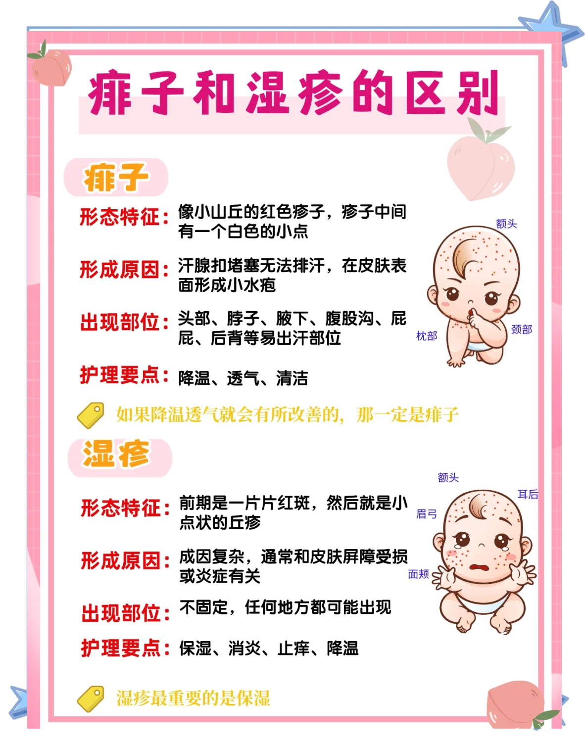 每天2次物理降温,比如用冷藏毛巾冷敷患处35分钟 2 保持透气 穿透气的纯棉衣物,出汗后及时更换睡眠时铺亚麻凉席,或垫吸水的纯棉纱布巾避免长时间怀抱婴儿,用婴儿车遮阳棚通风散热 3 外用止痒 用医用棉签蘸炉甘石洗剂点涂痱子,一日34次摇匀后使用若出现脓痱,可用05%。