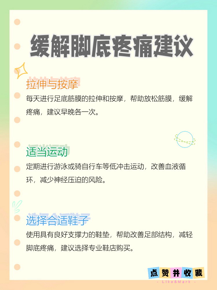 9、走路时脚底疼痛可能是由于筋膜炎症导致,通常伴随局部压痛红肿或活动受限,可能由扁平足或穿不适合鞋引发以下是治疗方法一更换舒适软性鞋 选择鞋底柔软支撑性好的鞋子,以减轻脚底压力二外用药物 局部涂抹非甾体抗炎药如泽普思软膏或贴剂,有助于减轻炎症和疼痛三筋膜枪治疗 使用。