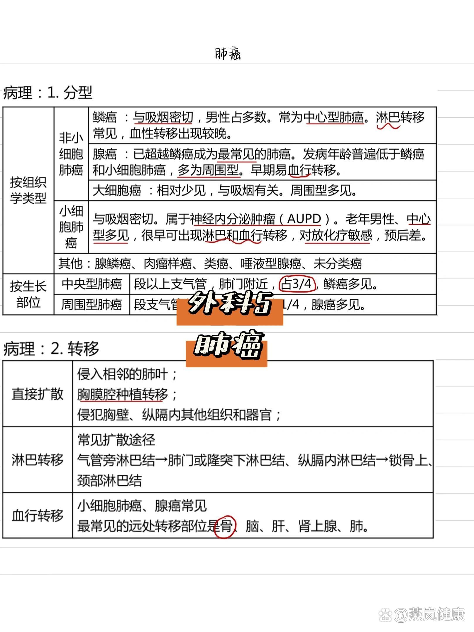 肺癌主要分为非小细胞肺癌和小细胞肺癌两大类型,具体细分如下非小细胞肺癌1鳞状细胞癌鳞癌多见于老年男性,与吸烟密切相关常起源于较大支气管,以中央型为主,影像学表现为肺门附近肿块癌细胞呈鳞状上皮分化,生长较慢,转移较晚,但对放化疗敏感性低于小细胞肺癌2腺癌近年发病率;小细胞肺癌起源于支气管黏膜的嗜银细胞,约占肺癌的15%~20%其特点是生长迅速,转移较早,对化疗和放疗较为敏感,但容易复发和转移小细胞肺癌的治疗以化疗和放疗为主,早期患者可能结合手术治疗,但整体预后较差肺癌的类型不同,治疗方法和预后也有所差异确诊后,医生会根据肿瘤类型分期患者;2小细胞肺癌约占肺癌总数的15%,起源于支气管黏膜的Kulchitsky细胞,属于神经内分泌肿瘤细胞体积小核深染,生长迅速且早期广泛转移对放化疗敏感但复发率高,预后不佳根据疾病范围分为局限期肿瘤局限于一侧胸腔和广泛期超出局限期范围二按解剖学部位分类1中央型肺癌发生在段支;一肺癌的类型肺癌主要分为非小细胞肺癌NSCLC和小细胞肺癌SCLC两大类非小细胞肺癌约占80%85%腺癌女性相对多见,常发生于肺周边,与环境污染吸烟尤其非吸烟女性相关,起源于支气管黏膜上皮的黏液腺或Clara细胞鳞状细胞癌鳞癌多见于老年男性,与吸烟密切相关,起源于段或。
