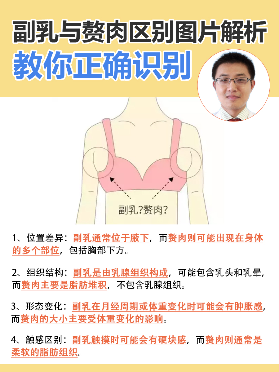 腋下淋巴和副乳的区别主要体现在以下方面发生原因腋下淋巴主要与乳腺炎症或乳腺恶性肿瘤有关当乳腺发生炎症时,可能导致腋下淋巴结肿大并伴有疼痛及发热而乳腺恶性肿瘤则可能出现腋窝淋巴结的转移,表现为局部融合压痛等症状副乳属于先天发育性异常,多发生于腋窝,是乳房组织在除正常乳房位置外;副乳与淋巴结的核心区别在于组织本质与结构特征组织类型差异副乳本质是乳腺腺体组织,属于乳腺的变异发育,可能含完整的乳腺结构如腺泡导管,甚至具备乳头和乳晕其存在形式包括完全型含乳头乳晕和不完全型仅腺体淋巴结则由淋巴组织构成,是免疫系统的重要组成部分,内部为淋巴细胞聚集形成;治疗方法不同副乳的治疗方法主要有手术切除和保守治疗对于症状明显影响美观或有恶变风险的副乳,通常建议手术切除而对于症状较轻无恶变倾向的副乳,可采取保守治疗,如穿戴合适的内衣等慢性腋窝淋巴结炎的治疗重点在于抗感染治疗和对症治疗根据引起炎症的病原体,选用合适的抗生素进行抗感染治疗;副乳和淋巴结在解剖位置形态特征超声等影像学表现以及功能方面存在明显区别解剖位置副乳通常位于正常乳房的上方下方或腋下等区域,是对称或非对称分布的多余乳腺组织,与胚胎期乳腺始基的分布相关其位置多集中在躯干前侧靠近乳房的区域,不同年龄性别均可出现,女性因乳房发育更易被发现淋巴结则。