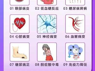 12、糖尿病并发症分为急性并发症和慢性并发症两大类,具体如下急性并发症1糖尿病酮症酸中毒因胰岛素严重缺乏,导致脂肪分解加速,产生大量酮体,引发代谢性酸中毒患者常表现为呼吸深快呼气有烂苹果味恶心呕吐脱水甚至昏迷,若未及时救治可能危及生命2糖尿病非酮症高渗状态多见于老年2型。