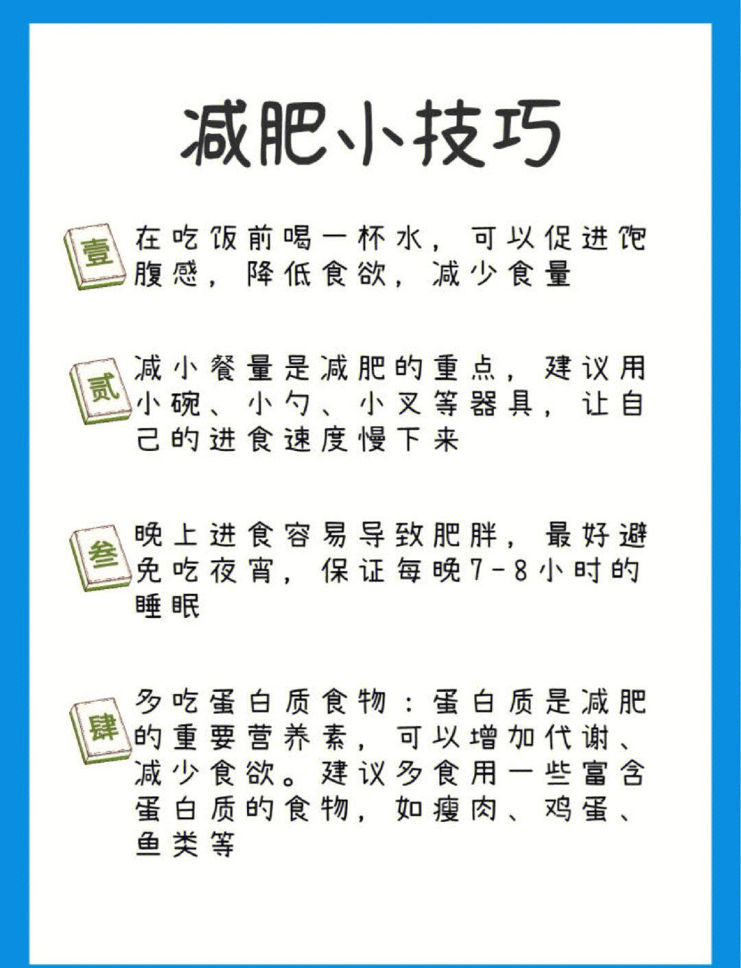 1、学生节食减肥需要兼顾健康与学业需求,以下为具体可行的方法,分为饮食调整生活习惯及注意事项三部分说明一饮食调整控制总热量但不过度削减 每日减少约300500大卡如减少1碗米饭或1份零食,避免低于1200大卡天,否则可能影响学习和代谢替代法用全麦面包代替白面包,无糖豆浆代替含糖饮料,水;学生快速有效减肥的方法如下合理饮食学生需保证每日营养均衡,减少高热量高脂肪高糖分食物的摄入,例如油炸食品奶茶甜点等增加蔬菜水果全谷物及优质蛋白质如鸡胸肉鱼豆类的摄取,既能提供身体所需能量,又能避免热量过剩同时,要规律进食,避免暴饮暴食,控制每餐分量,养成定时;五注意事项1避免极端方法拒绝过度节食催吐或减肥药,防止营养不良代谢紊乱或器官损伤2咨询专业人士营养师可制定个性化饮食计划,医生或健身教练能指导科学运动方案3定期监测健康每月测量体重体脂率,每年进行体检,确保减肥过程不影响生长发育学生减肥需平衡学业与健康,避免因减肥;五避免极端减肥方法切勿使用减肥药过度节食等极端手段减肥药可能含违禁成分,导致心悸腹泻等副作用过度节食会引发营养不良内分泌紊乱,甚至反弹减肥需循序渐进,以健康为首要目标,而非追求短期效果总结学生党减肥需结合饮食运动作息和习惯调整,避免极端方法科学减重不仅能改善体型;第一,学生减肥应该坚持每天一杯柠檬水,能够起到减肥瘦身的作用,柠檬水具有消耗脂肪的作用,可以加快人体内脂肪的消耗,学生减肥一定要选择健康安全的减肥方法,每天一杯柠檬水可以越喝越瘦第二,学生减肥应该要坚持跑步的运动,学生减肥每天早上坚持跑步半个小时以上可以成功的减肥瘦身,同时也可以提高人体的免疫功能,加快人;学生减肥需综合采用合理饮食增加运动规律作息三种方式,但无绝对“最有效”的单一方法,需根据个体情况调整并长期坚持合理饮食是基础学生应规律三餐,早餐需保证营养,可选择鸡蛋牛奶全麦面包等富含蛋白质和膳食纤维的食物,为上午学习提供稳定能量午餐和晚餐需营养均衡,以蔬菜瘦肉鱼类;控制零食摄入尽量减少高盐高油高糖零食如薯片巧克力奶茶的摄入若需加餐,可选择健康零食如原味坚果无糖酸奶新鲜水果,但需控制量如坚果每日1015克此外,避免边学习边吃零食的习惯,减少无意识进食通过以上方法,学生可在不影响学习效率的前提下,逐步实现健康减重。
